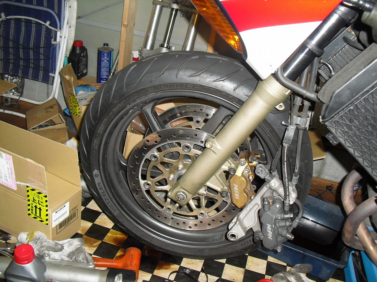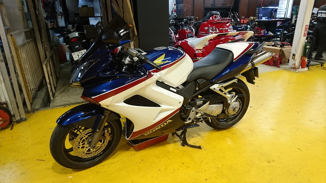 最近、当社で販売、カスタムが多い歴代VFR。 特にVFR800Fは最近増殖中です。 私も所有してるのでその影響も多少あるかと思いますが、とにかく万能マシンで 少し手を加えるだけでかなりの官能マシンになります。 ワイバンさんのスリップオンにやベビーフェイスさんのステップでかなりレーシーに。 こちらの車両はサブコンも入れてトルクフルに。 リフトには二台の白いVFR800Fが。 一台はオイル交換。 もう一台は… ヘビーカスタム開始。 フォーク換装に対応して剛性バランス調整でステムアンダー交換、 もちろんステムベアリングも交換。 本命のオーリンズの正立フォーク。 めちゃくちゃ格好いい! さらにブレンボのモノブロックなどガッツリカスタム。 ディスクも交換して、本当はホイールも交換予定でしたが昨今の欠品地獄で 納期はなんと来年5月… とりあえずノーマルホイールで納めます。 さあどんな走りを見せてくれるでしょうか、楽しみですね~。 当店ではホンダ系バイクのカスタムも得意としております。 特に90年代以降はデータも豊富です。遠慮なくtお問い合わせください。