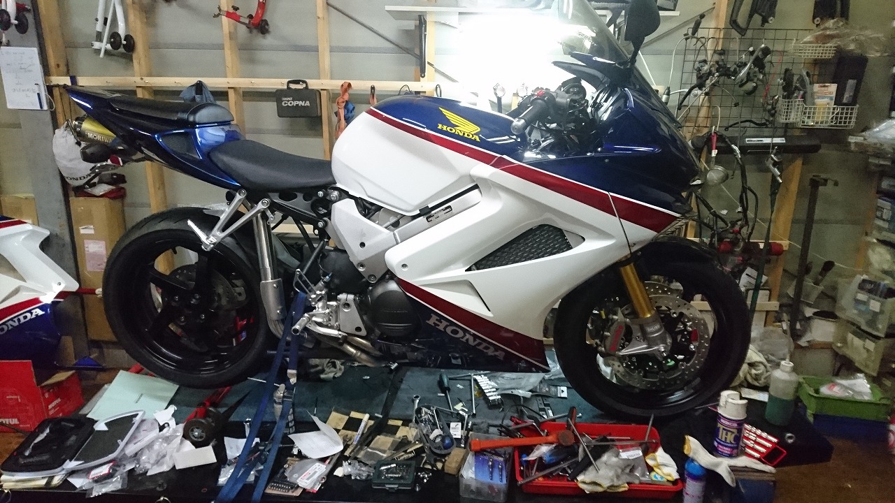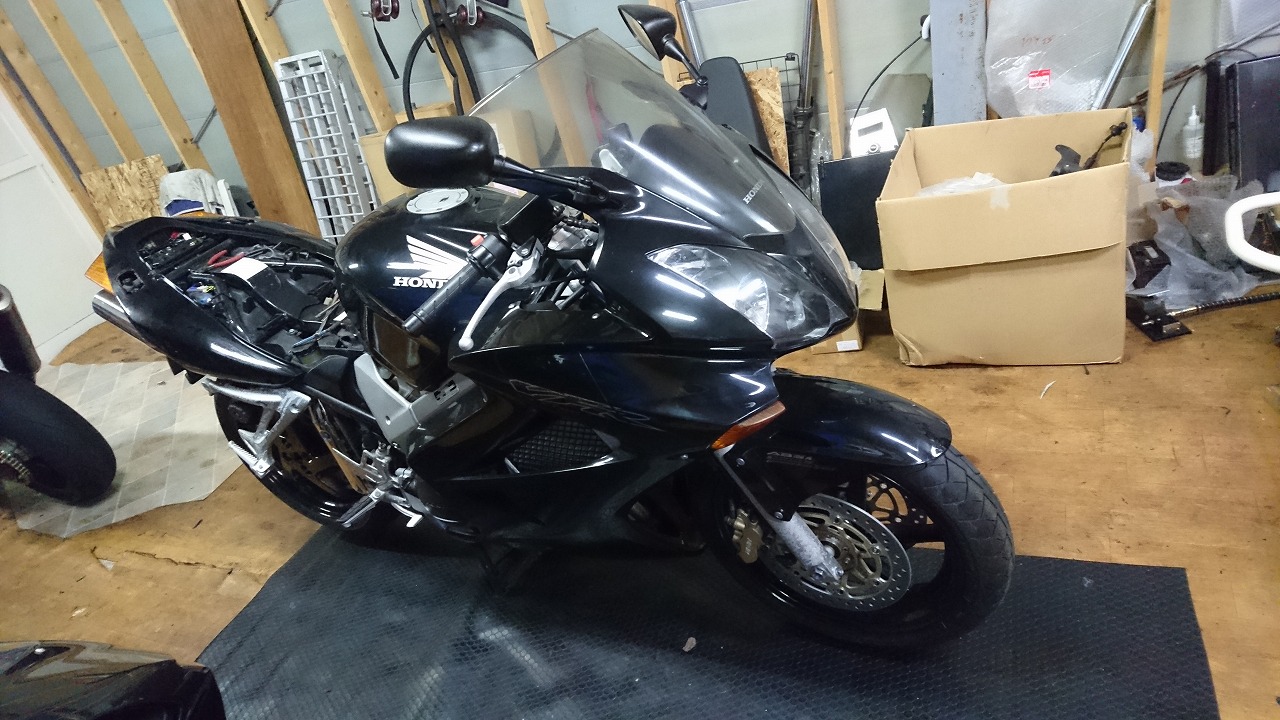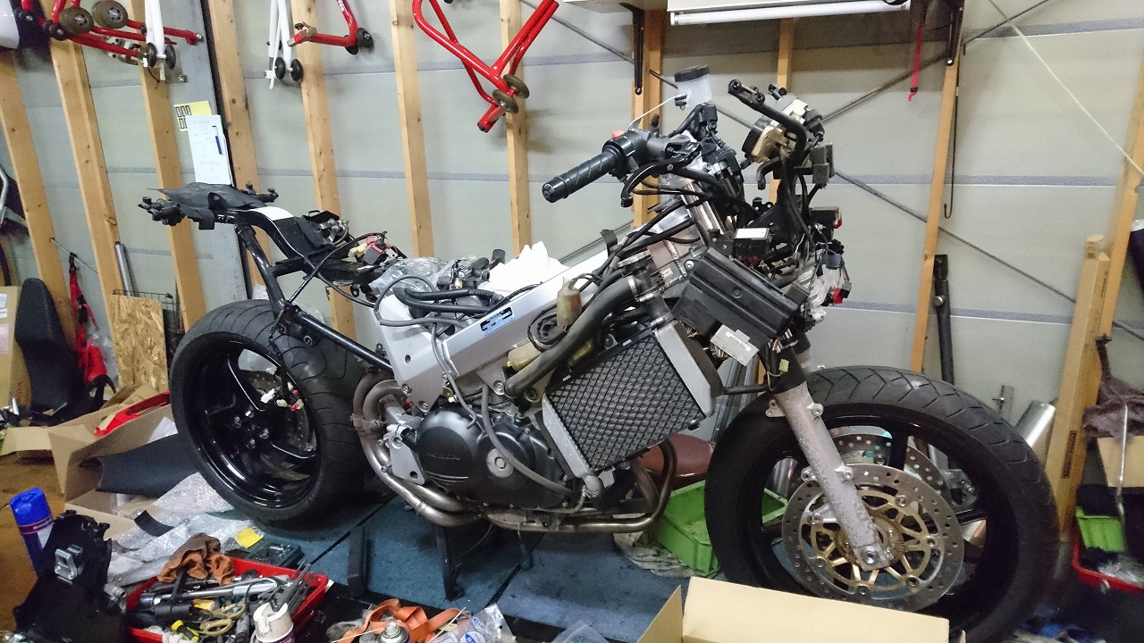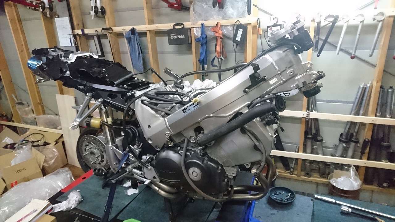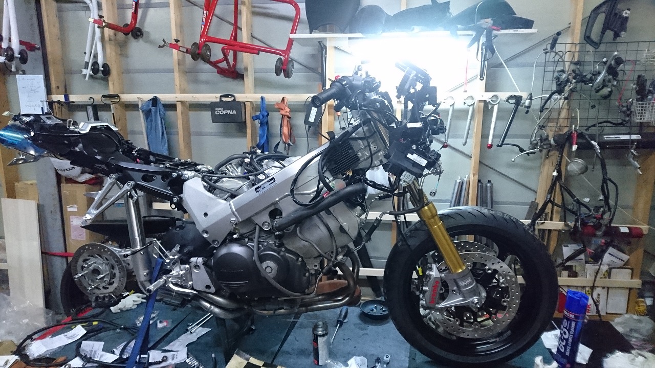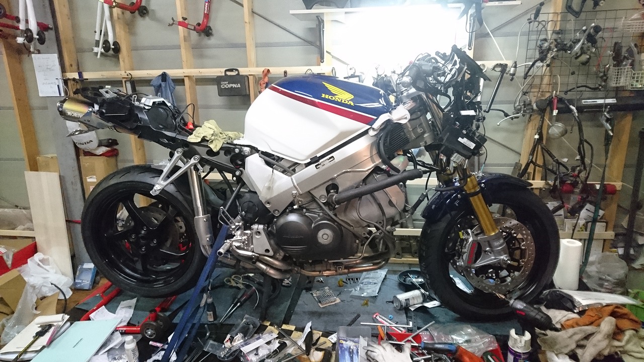 すっかりV4エンジンに魅せられた僕ですが、RC30を手放したのを後悔しつつ もんもんとしてました。 またVTECエンジンになったV4エンジンはカムギヤトレーンではなくカムチェーンで 長距離を走行するのに静かで快適なんですが、少し刺激が足りないかなと。 かと言って、RC30やRC45はもはや高すぎて買えない(笑) なので、安価なVFR800、RC46の前期型、白バイのベースになった カムギヤトレーンのツーリングモデルに狙いを定めました。 これはRC45のエンジンをストロークアップして800㏄にしたバイクなので、実は レーサーの心臓を持つツアラーです。 これをベースにレーサータイプに変えれないか?と。 幸い逆輸入の低走行車が見つかり即購入。 早速バラして、手持ちのVTR-SPのレーサーカウルを仮組してみると お! なんとか付きそうだ! ここから苦難の作業が始まりました。 元々ツアラーの車体をレーサータイプにする作業は本当に大変でした。 とりあえずデータも何もないので形にしていきます。 ステムはRC46後期の43Π、フォークはCBR600Fベースで当然連動ブレーキ解除。 シートレールはSP1のを付けれるようにげたをかまし、配線処理。 メーターも狭いカウルに入らないので小型のものに。 エンジンは最初は800Fのセンターラジエーターを付けてパワーコマンダーで セッティング。 スイングアームも800F用にしたり色々しました。 とりあえずレーサーカウルが付くようにして、ヘッドライトが付くようになんとか形に。 先にカウルを塗装に出して、手持ちのSPのノーマルカウルを取り付け試乗してみることに。 乗ってみると、エンジンも細いエキパイのせいかトルクが細く、車体はハンドリング が重くどうにもならないような代物でした(笑) VFR800のステムはオフセット多めで軽快感でると思ったのに… さあイチからやり直し。Rショックの特注やステップなどと入れていきます。 前後の車高も色々変えながら探っていきます。 そうしてるうちに塗り上がってきたので、先に外装組付けです。 めっちゃかっこよくなったので期待に満ちた走行でしたが、 やっぱりダメ。車体の姿勢、エンジンのセッティングなど問題山積み。 結局エキパイはノーマルの太いのに戻し、取り回しの関係でノーマルの サイドラジエーターに戻し、セッティング。 エンジンはV4らしいトルクになりいい感じに。 やっぱり800Fはガスを使えないのをエキパイ絞ったりメーカーは苦労して るんやなあ、と。 ただ車体はやはりこのままではダメなので色々試行錯誤。 前を上げたり下げたり、後ろを上げたり下げたり…スプリング換えたり。 最終FフォークはCBR600RR流用で姿勢をセッティング。 なんとかなって、まあちゃんと走るようになりました。 現状では80%くらいの満足度。 これ以上はスイングアームピボット位置を下げたり、前後に短いアルミタンクを 作ってもっと前に乗れるようにとか、めちゃくちゃお金かかるし現実的じゃない ので(それこそRC30とかRC45買えてしまう 笑)ここまで。 その後は細かい変更をしながらソロでマスで走り、お客様にも試乗してもらい意見をもらい なんとか人前に(?)出せるようになりました。(笑) 難点はタンクが容量多くて前後に長いので姿勢がちょっとしんどいくらいで、 航続距離は長いしロングも大丈夫なバイクになりました。 足掛け4年本当に大変で勉強になりましたが、やはりRC30や45 のような素晴らしいバイクには及ばず、若干の虚しさを感じる結果に なったのは内緒です(笑)