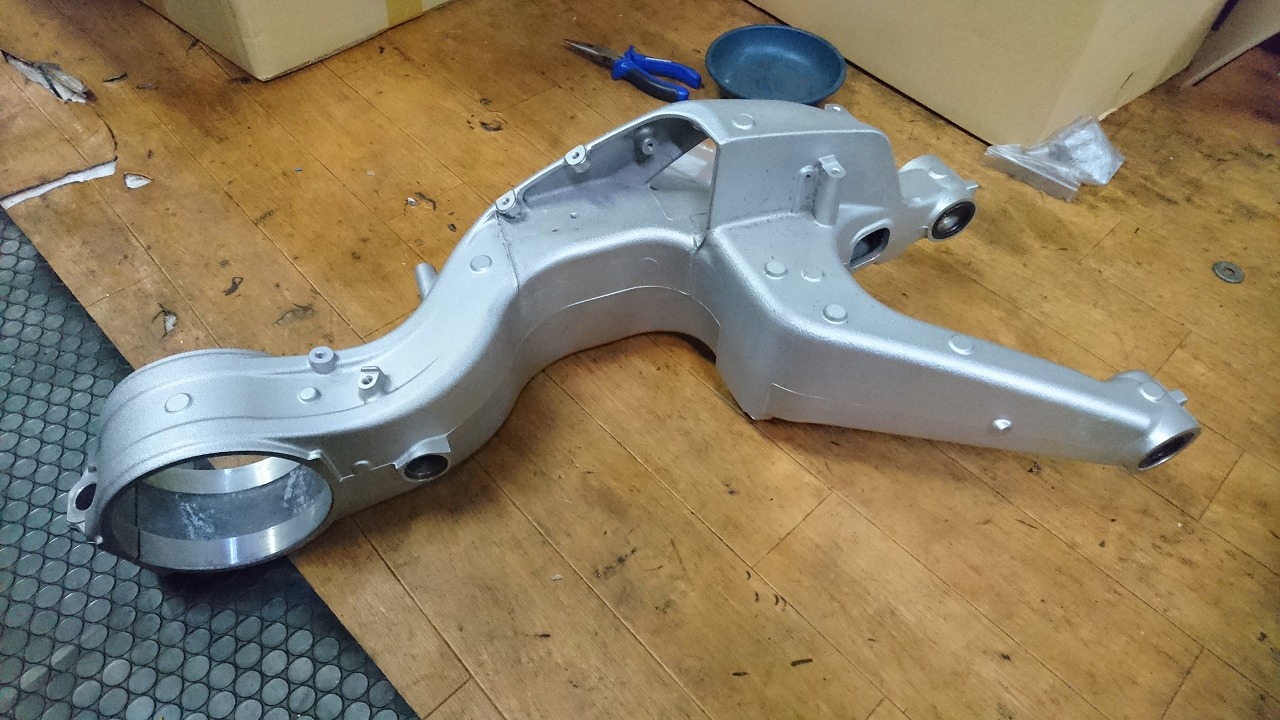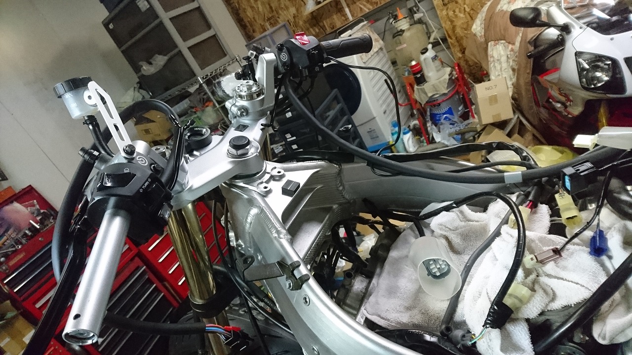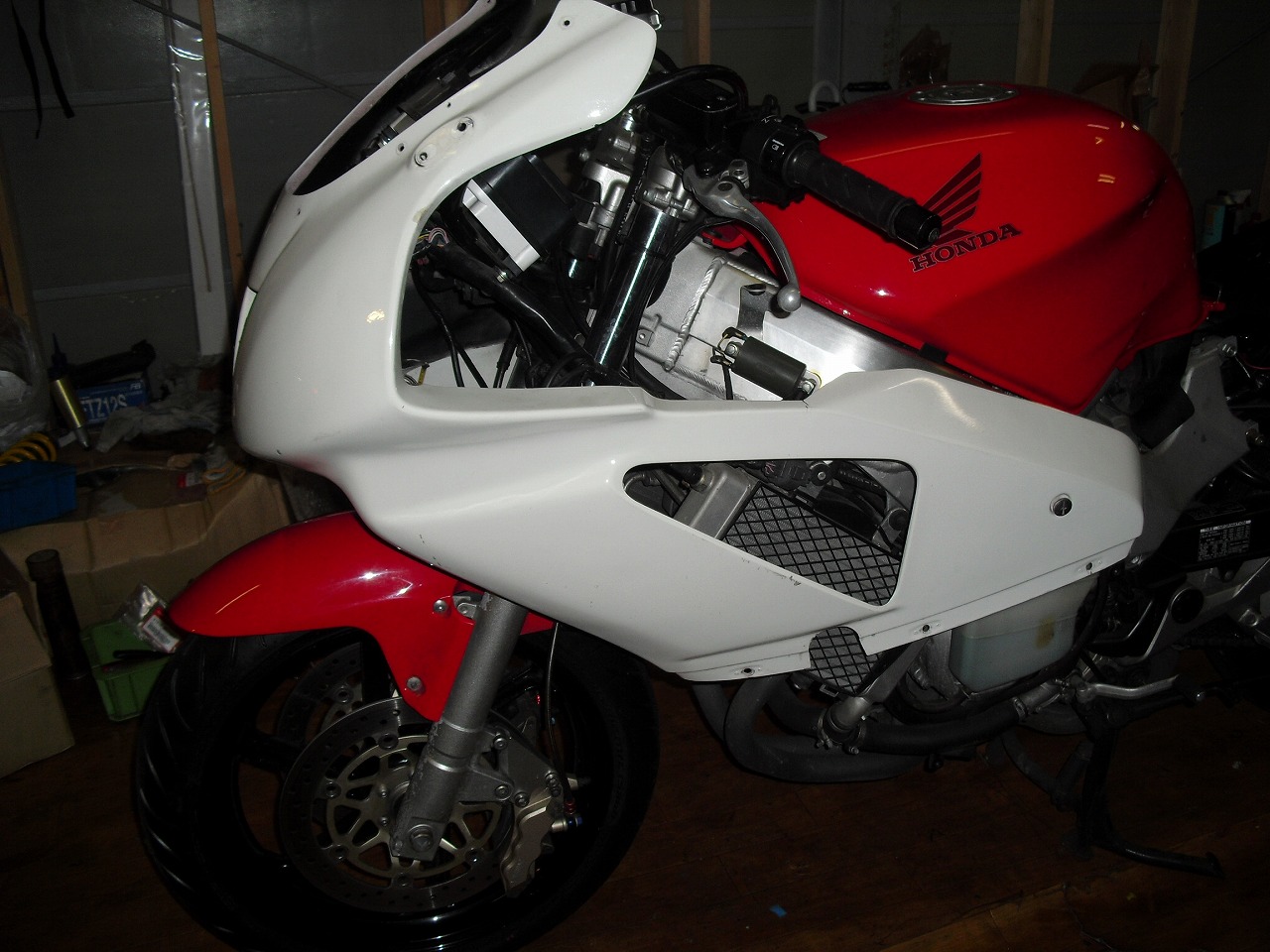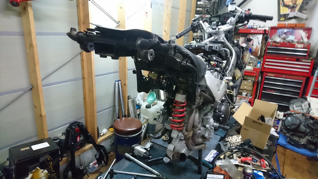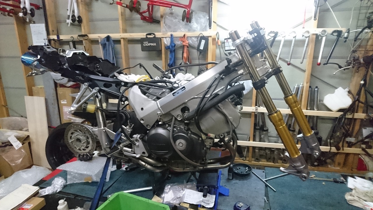 すっかりV4エンジンに魅せられた僕ですが、RC30を手放したのを後悔しつつ もんもんとしてました。 またVTECエンジンになったV4エンジンはカムギヤトレーンではなくカムチェーンで 長距離を走行するのに静かで快適なんですが、少し刺激が足りないかなと。 かと言って、RC30やRC45はもはや高すぎて買えない(笑) なので、安価なVFR800、RC46の前期型、白バイのベースになった カムギヤトレーンのツーリングモデルに狙いを定めました。 これはRC45のエンジンをストロークアップして800㏄にしたバイクなので、実は レーサーの心臓を持つツアラーです。 これをベースにレーサータイプに変えれないか?と。 幸い逆輸入の低走行車が見つかり即購入。 早速バラして、手持ちのVTR-SPのレーサーカウルを仮組してみると お! なんとか付きそうだ! ここから苦難の作業が始まりました。 元々ツアラーの車体をレーサータイプにする作業は本当に大変でした。 とりあえずデータも何もないので形にしていきます。 ステムはRC46後期の43Π、フォークはCBR600Fベースで当然連動ブレーキ解除。 シートレールはSP1のを付けれるようにげたをかまし、配線処理。 メーターも狭いカウルに入らないので小型のものに。 エンジンは最初は800Fのセンターラジエーターを付けてパワーコマンダーで セッティング。 スイングアームも800F用にしたり色々しました。 とりあえずレーサーカウルが付くようにして、ヘッドライトが付くようになんとか形に。 先にカウルを塗装に出して、手持ちのSPのノーマルカウルを取り付け試乗してみることに。 乗ってみると、エンジンも細いエキパイのせいかトルクが細く、車体はハンドリング が重くどうにもならないような代物でした(笑) VFR800のステムはオフセット多めで軽快感でると思ったのに… さあイチからやり直し。Rショックの特注やステップなどと入れていきます。 前後の車高も色々変えながら探っていきます。 そうしてるうちに塗り上がってきたので、先に外装組付けです。 めっちゃかっこよくなったので期待に満ちた走行でしたが、 やっぱりダメ。車体の姿勢、エンジンのセッティングなど問題山積み。 結局エキパイはノーマルの太いのに戻し、取り回しの関係でノーマルの サイドラジエーターに戻し、セッティング。 エンジンはV4らしいトルクになりいい感じに。 やっぱり800Fはガスを使えないのをエキパイ絞ったりメーカーは苦労して るんやなあ、と。 ただ車体はやはりこのままではダメなので色々試行錯誤。 前を上げたり下げたり、後ろを上げたり下げたり…スプリング換えたり。 最終FフォークはCBR600RR流用で姿勢をセッティング。 なんとかなって、まあちゃんと走るようになりました。 現状では80%くらいの満足度。 これ以上はスイングアームピボット位置を下げたり、前後に短いアルミタンクを 作ってもっと前に乗れるようにとか、めちゃくちゃお金かかるし現実的じゃない ので(それこそRC30とかRC45買えてしまう 笑)ここまで。 その後は細かい変更をしながらソロでマスで走り、お客様にも試乗してもらい意見をもらい なんとか人前に(?)出せるようになりました。(笑) 難点はタンクが容量多くて前後に長いので姿勢がちょっとしんどいくらいで、 航続距離は長いしロングも大丈夫なバイクになりました。 足掛け4年本当に大変で勉強になりましたが、やはりRC30や45 のような素晴らしいバイクには及ばず、若干の虚しさを感じる結果に なったのは内緒です(笑)