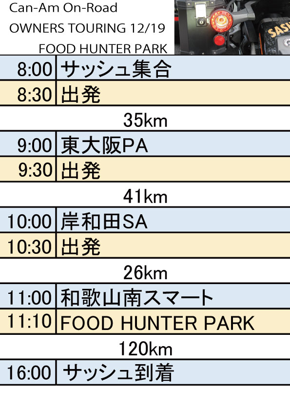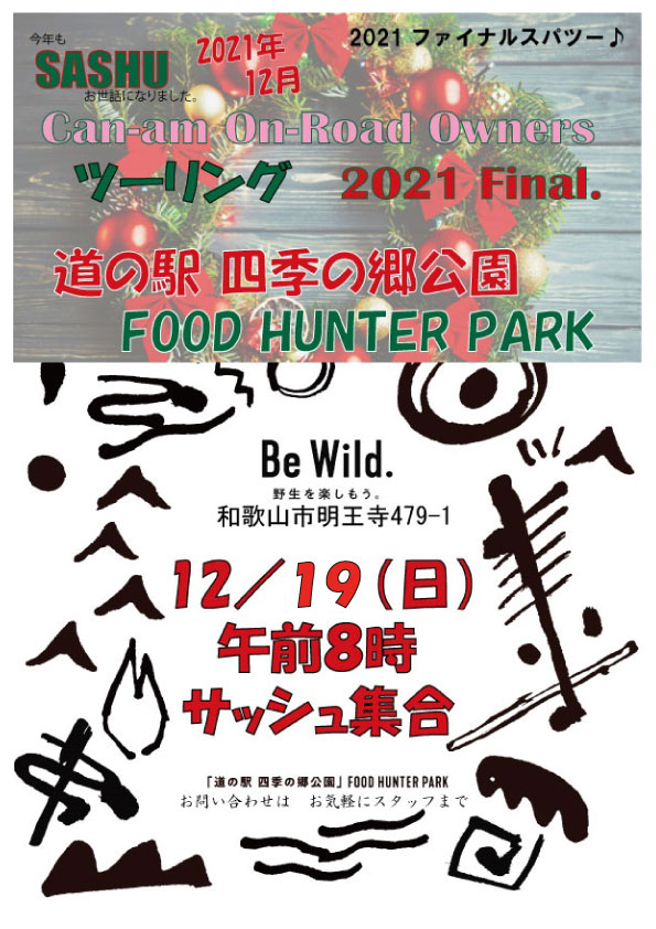 冬こそ、カンナムオンロード。寒さの向こうの、楽しさへ。 って事で、2021年ファイナルスパツー決定しました! 12/19 (日) 午前8時 サッシュ集合 「道の駅 四季の郷公園」 (和歌山県和歌山市) - FOOD HUNTER PARK - (サイトへジャンプ) ※今回はBBQではなく レストランでのランチになります。 道中、集合場所が 3か所ございます。 30分に一回、30分 休憩します。 ファイナルスパツーも 緩めで 締めます。 なんと言っても 最後なので みなさん ぜひ ご参加ください。 今年は企画が少なく 退屈な おもいをさせてしまい 申し訳ございません。 2022年はしっかりやりたいと思います。