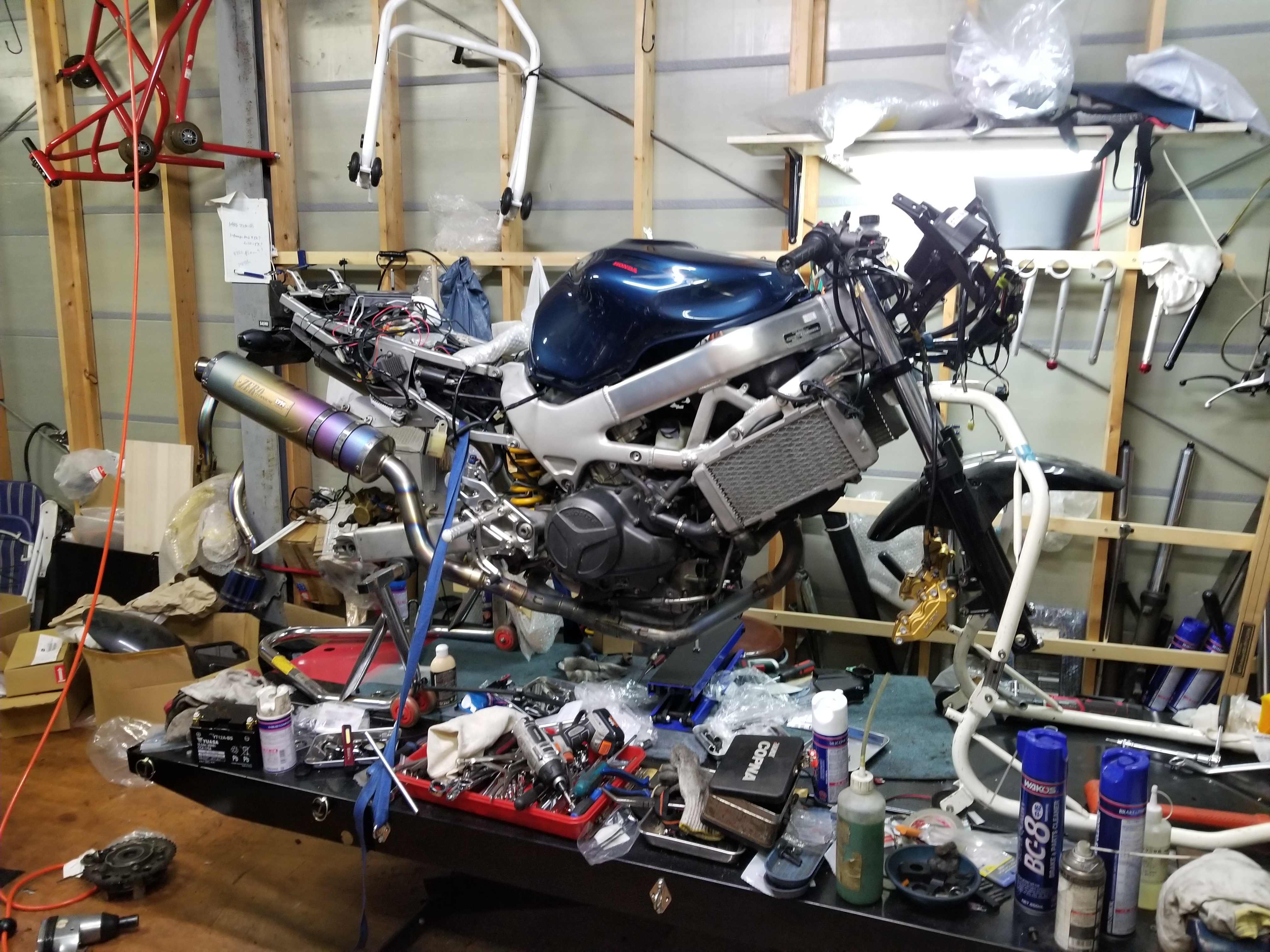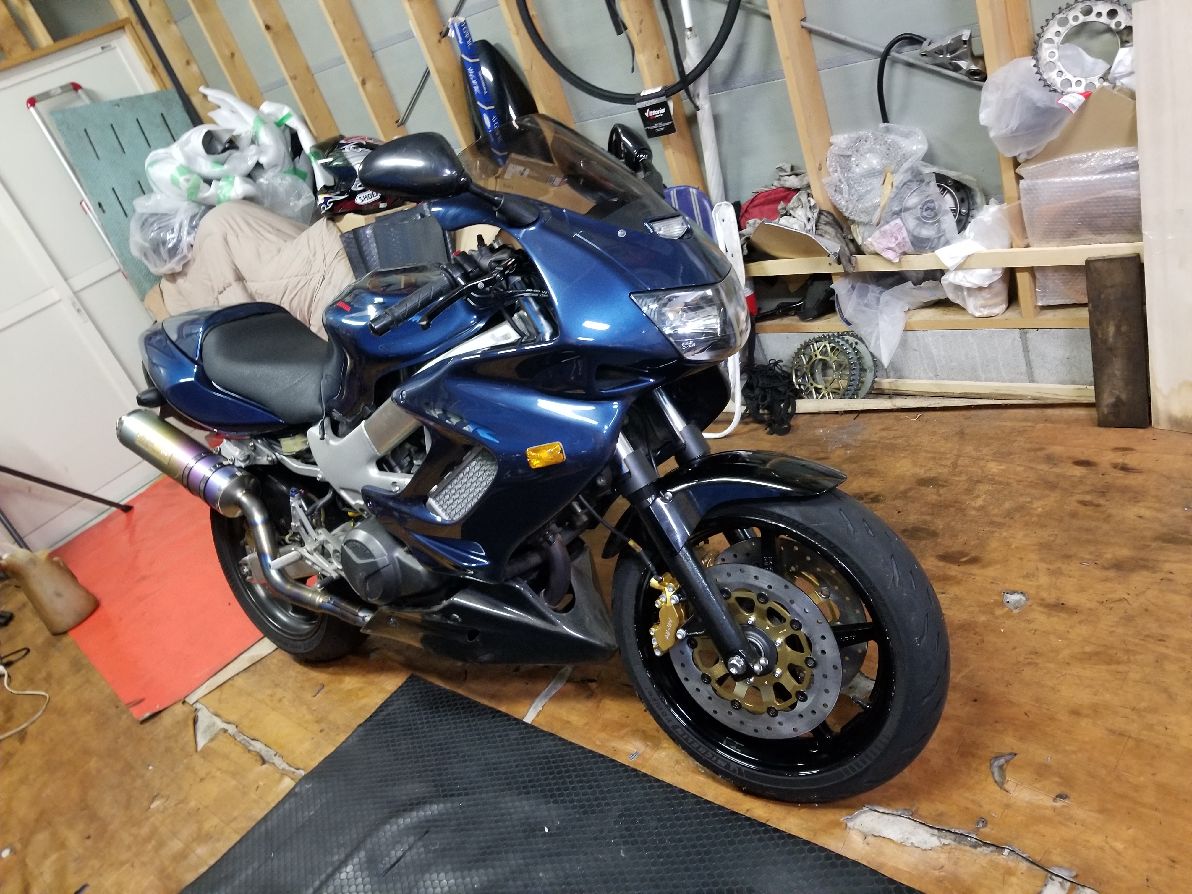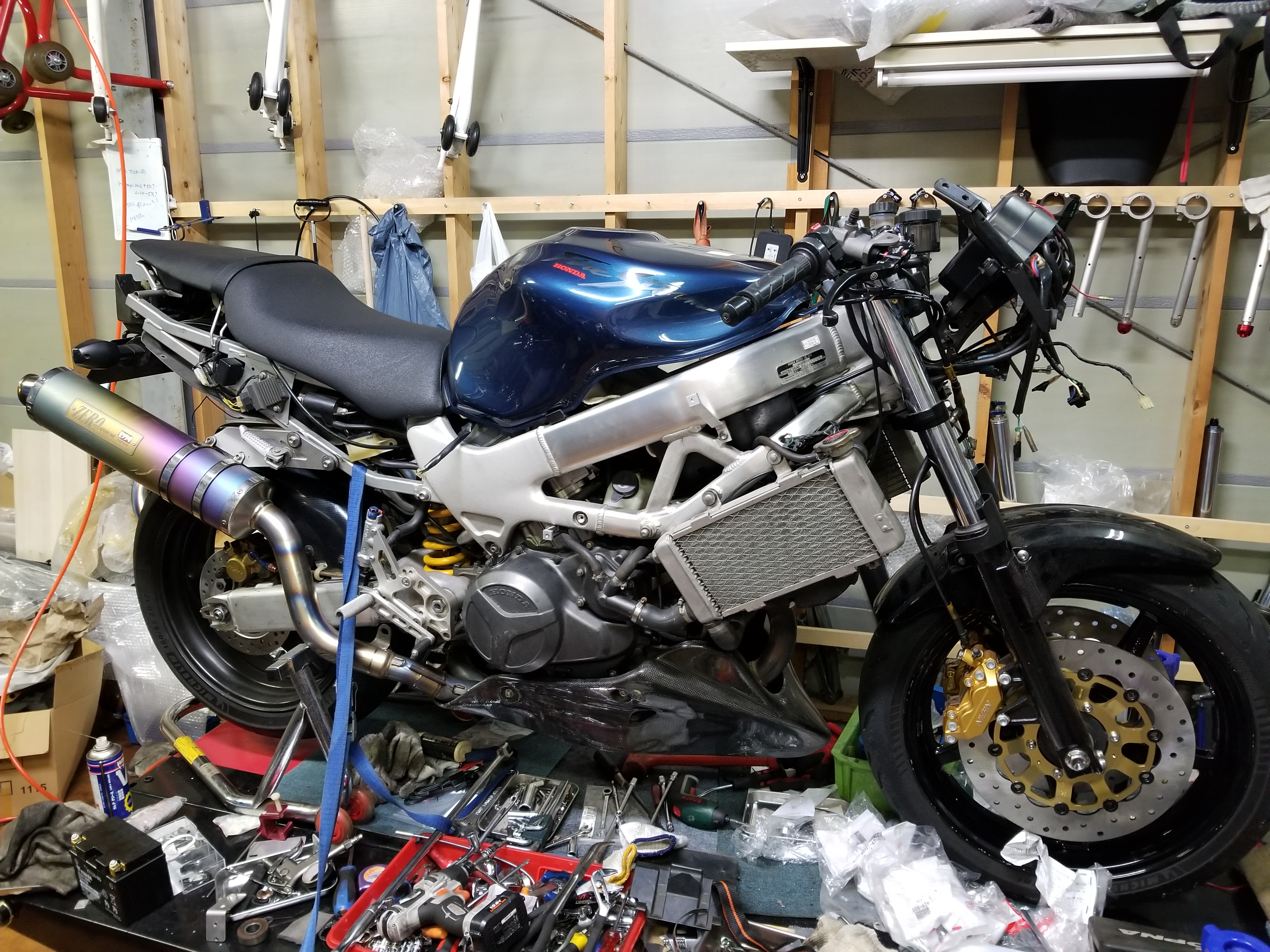 皆様こんにちは!いよいよ年末ですね。 皆様良いお年をお迎えください。 今回はツーリングレポートではなく、私、アッキーのバイク人生において重要な役割を はたしたバイクの紹介、お客様のバイク試乗したりで印象に残ったバイクの紹介を不定期に連載していきたいと思います。 まず、紹介したいのはVTR1000Fという25年も前に発売されたバイクです。 サッシュに入社する前に購入したバイクです。 当時私はCBR900RRを乗り継いでた4気筒大好きな青年でした。 ひょんなことから購入したVTR。初めての2気筒エンジンに戸惑ったのを覚えております。 今までのCBRのように上手くいかなくて四苦八苦。フロントが常に1本外を走るような感覚で アクセル開けるとアンダーステアのような感じで自信を失いました。 しかししばらくして2気筒の鼓動と、力強い加速にハマり色々工夫してるうちに上手く 操れるようになり赤い車体から黒い車体2代にわたり10数万キロ走りまくりました。 ツーリングでは皆様と一緒に。サーキットも結構走り、ソロツーリングでは信州や九州四国などワインディングを走りまくりが本当に楽しかった。 このバイク、正直言って特に特筆すべきカタログスペックはありません。 馬力は100馬力ほど、重量の200キロ弱。当時のレベルでも150馬力180キロ弱の車体のバイクがある中です。車体もフロントフォークも華奢ですし。 しかしこのバイクは本当に操る喜びにあふれ、コーナーリングの基礎が学べる車体でした。 コーナーリングスピードを上げてリスキーに走るのではなく、ピッチングを使い素早く向きを変えてスロットルを開けることによって速く走る、公道にフィットするスタイルを学ばせてもらいました。 またそうしないと、低い車体剛性や細いフォークのために安心して乗れません。 低いフロント加重(4気筒のようにエンジン搭載位置からくる自動的な荷重乗せが期待できない為)を補うためにライダーが工夫、タイミングを取る必要があります。 もちろんドカティなどはそういったテクニックが必要ですが、当時のドカティの車体価格や 超ピンポイントな車体設定はとても初心者が上達するために練習できるものではありませんでした。 その点VTRの素晴らしくて国産スポーツバイクとしても車体も安く、一応初心者から乗れるのに上達してレベルが上がるとそれに応えるように難しい所が出てくる感じです。 そうして得たテクニックは、のちに乗るVTR-SPやドカティなどにも通用しました。 そして、それは周りのお客様にも伝染し、未だにこのバイクをお乗りの方がいます。 もちろん僕も含め。 このバイクのことを僕は愛着を込めて牛丼バイクと呼んでいます(笑) 安い(価格)、はやい(意外と速い)、うまい(上手くなる)です。 現在はネイキッドアップハンにした車体と ハイコンプピストン、FCRなどを組み込んだ車体を作ってプラモデル感覚で楽しんでます(笑) エンジンもシンプルで自宅の設備で車種専用の特殊工具も必要なくオーバーホール可能でした。 そろそろ部品供給などが心配になってますが、まだ走るのに支障がでるほどではありませんし、ネットオークションなどもあるので、まだまだ乗り続けれると思います。 このバイクに関して、セットアップ、カスタム、チューニングなどそれこそ死ぬほどしてきて お金も無駄に使って来ましたので、最短距離のアドバイスができます。 もし買ったはいいけど乗るのに苦労したり困ったりしてる方はご来店の上相談ください。 ただし多忙のためアドバイスだけの方はご遠慮ください。 サッシュの秋田までよろしくお願いいたします。 といってる間にハイコンプピストンを組み込んで、フロントフォークを43Πにしたりし たVTRが出来上がりました! 試乗してきます(笑)