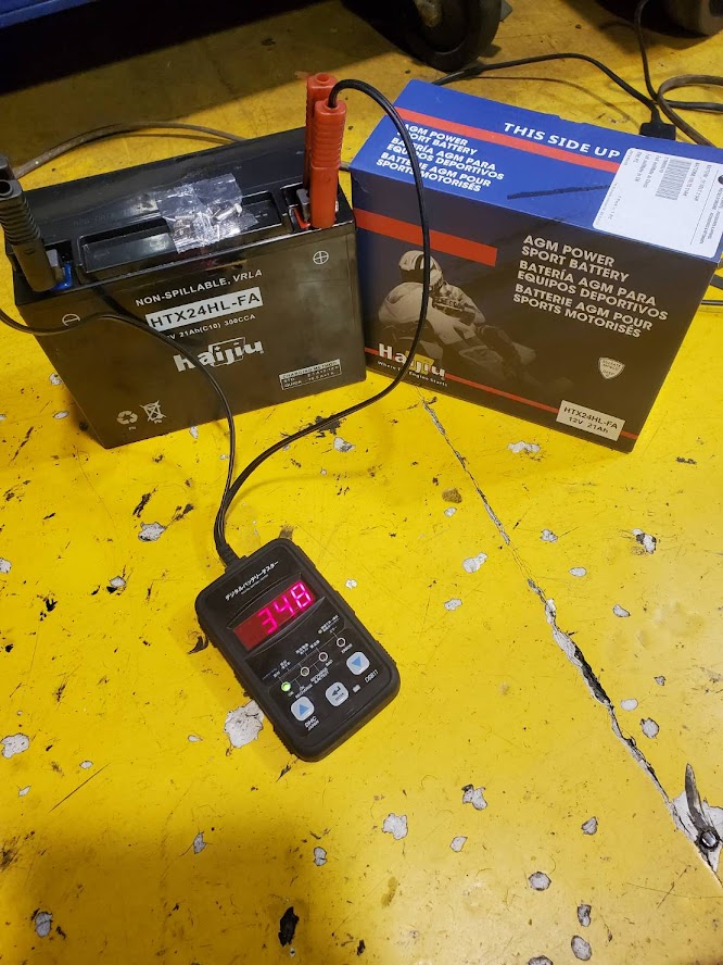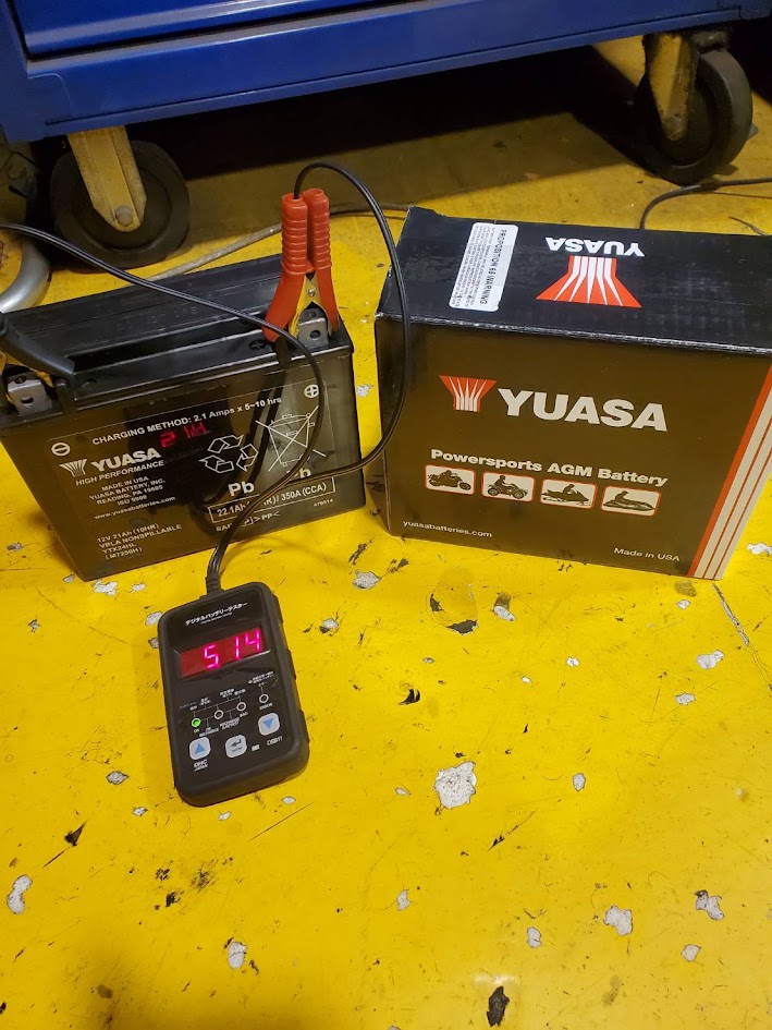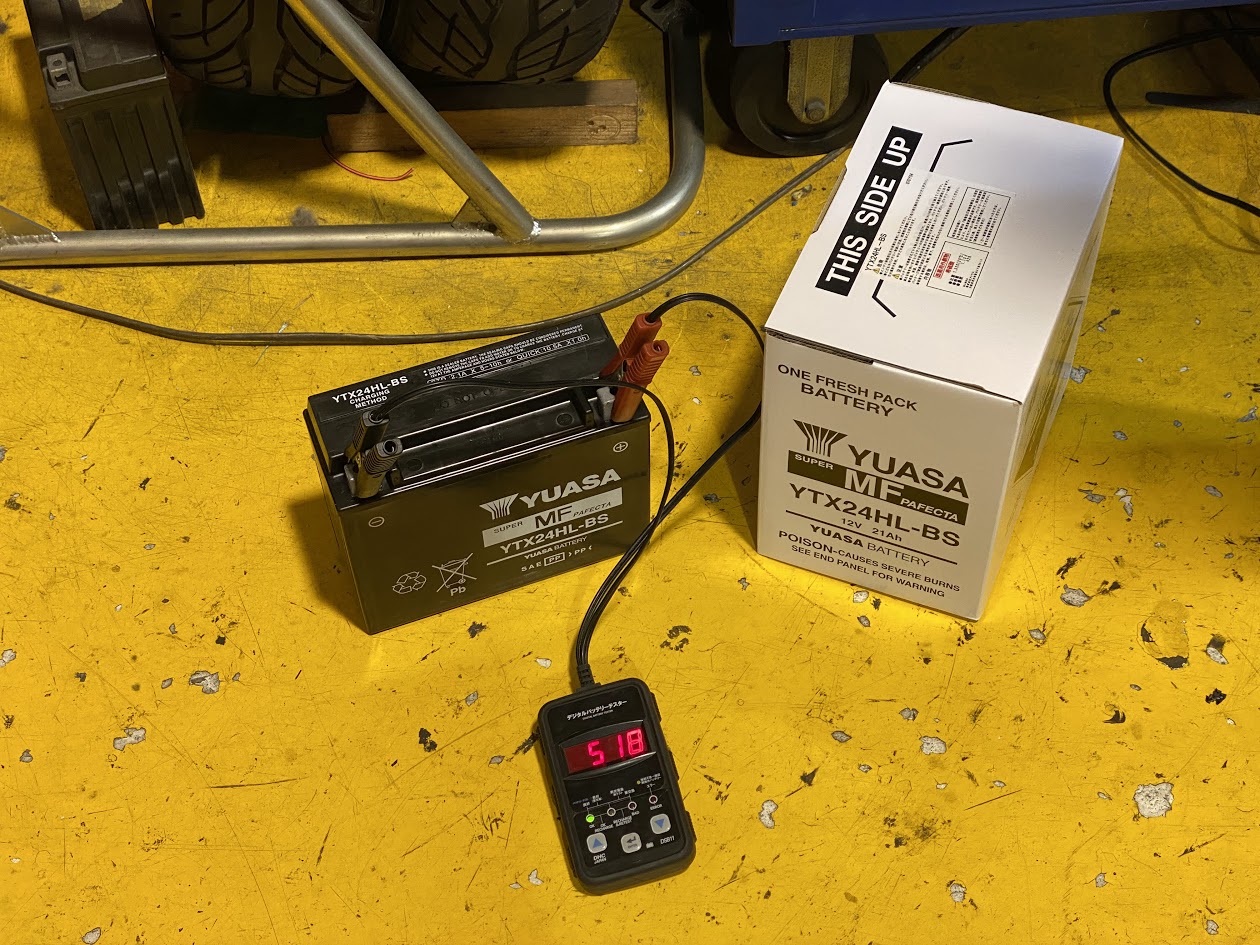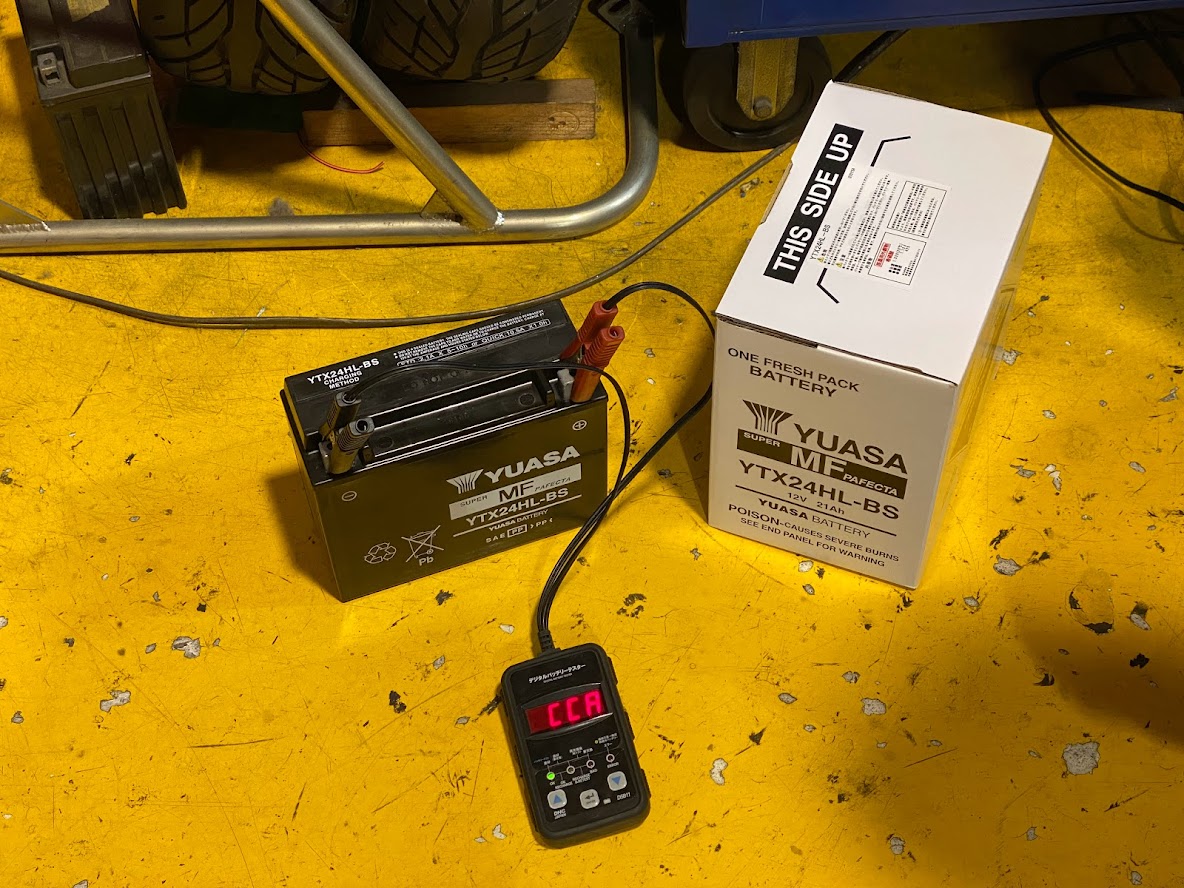 先日より 米中バッテリー比較の模様をお伝えしましたが、 ここで 新たに『 台湾 YUASA 』バッテリーが入荷しました。 同じように補充電を6時間行ってからCCA値を測定。 ここで、おさらいしておきます。 US YUASA のCCA値。 514。 メーカー純正Haijiu のCCA値。 348。 -6時間後- 台湾代表、台湾YUASAのCCA値はコチラ。 518! いやいや 本家、US YUASA以上やん(笑)・・・。 充分。いや、充分過ぎる! とゆうわけで、弊社では しばらく 台湾YUASAバッテリーを 推して行こうかなと思います。 今回 多くの在庫を確保しましたので 越冬が不安な方は交換をオススメします。