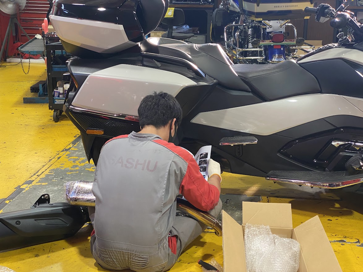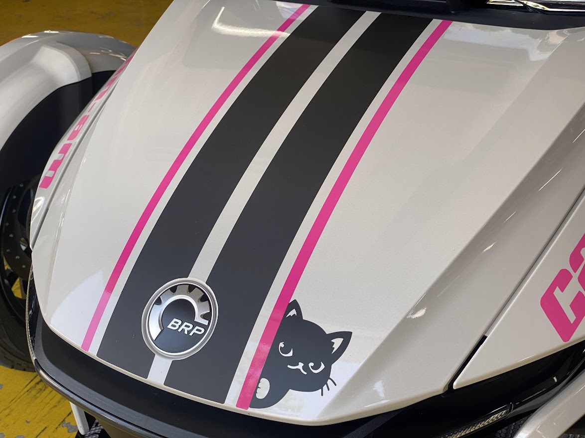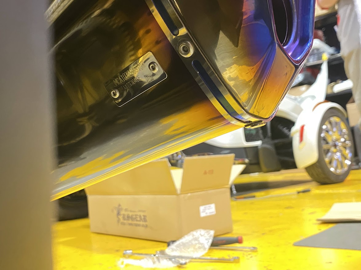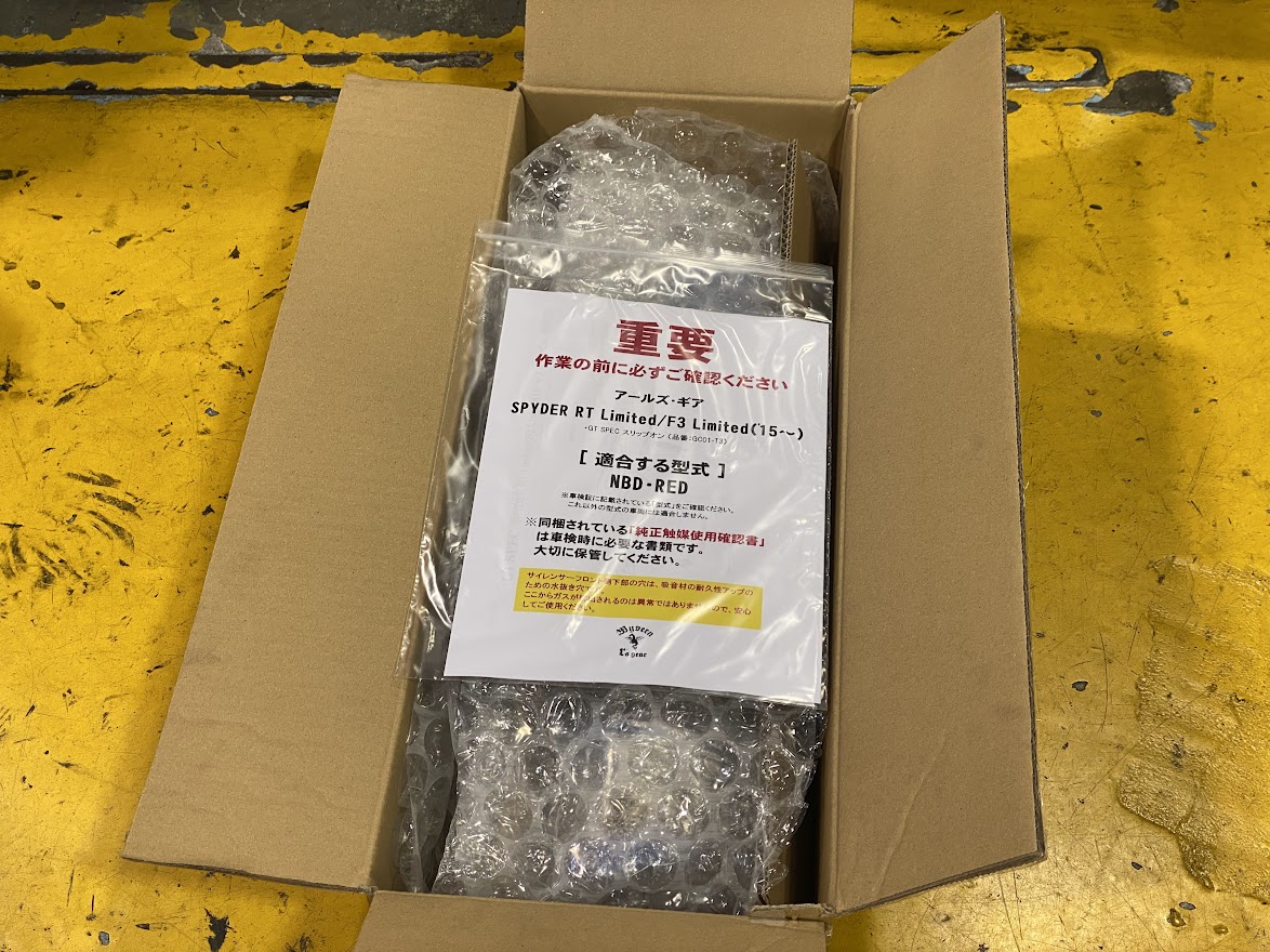本日 初回点検でご来店いただいた、 女性オーナーさまのRTが なんともかわいくて・・・ ひょっこり具合が・・・ これは きゅんです。 さて、こちらもピンクな働き者・・・ 梅雨明けにビッグニュースです。 以前アナウンスしておりました 車検対応・政府認証マフラーの デリバリーを開始しました! その名も・・・なんと! エンブレムにご注目。 アールズギア製 『 GT SPEC 』 スリップオン アールズギアさんには、 WYVERN、REAL SPEC、WYVERN SONIC、WYVERN CLASSIC、GP SPECという、 開発コンセプトとキャラクターの異なる5種類のマフラーがあります。 その第6となる GT SPEC 。 GT SPEC スリップオンには お買い上げ日より2年間で、 走行距離2万km以内 での 保証が付きます。 ラインナップと価格は以下の通りです。 ★RTリミテッド・F3リミテッド用 GT SPEC スリップオン(チタンポリッシュ) ¥200,000(税抜) ★RTリミテッド・F3リミテッド用 GT SPEC スリップオン(チタンドラッグブルー) ¥205,000(税抜) ★F3用 GT SPEC スリップオン(チタンポリッシュ) ¥200,000(税抜) ★F3用 GT SPEC スリップオン(チタンドラッグブルー) ¥205,000(税抜) 4種類ございます。 鏡面仕上げが美しい、チタンポリッシュ。 妖艶な焼き色仕上げ、ドラッグブルー。 ・・・正直これは悩みます。 どっちもいいなー・・・って人は ぜひ2本買ってください。 閉店間際に 試乗車のMY21 RTリミテッドに装着しました。 チタンポリッシュ?それともドラッグブルー? 取説読んでます。 今回は ドラッグブルー をチョイス。 裏側の JMCAプレートが なんとも誇らしい逸品です。 まさに ため息をつく 美しさ。 店頭で 質感・音質・音量をお確かめください。 部品 というより これはもう 作品 ですね。