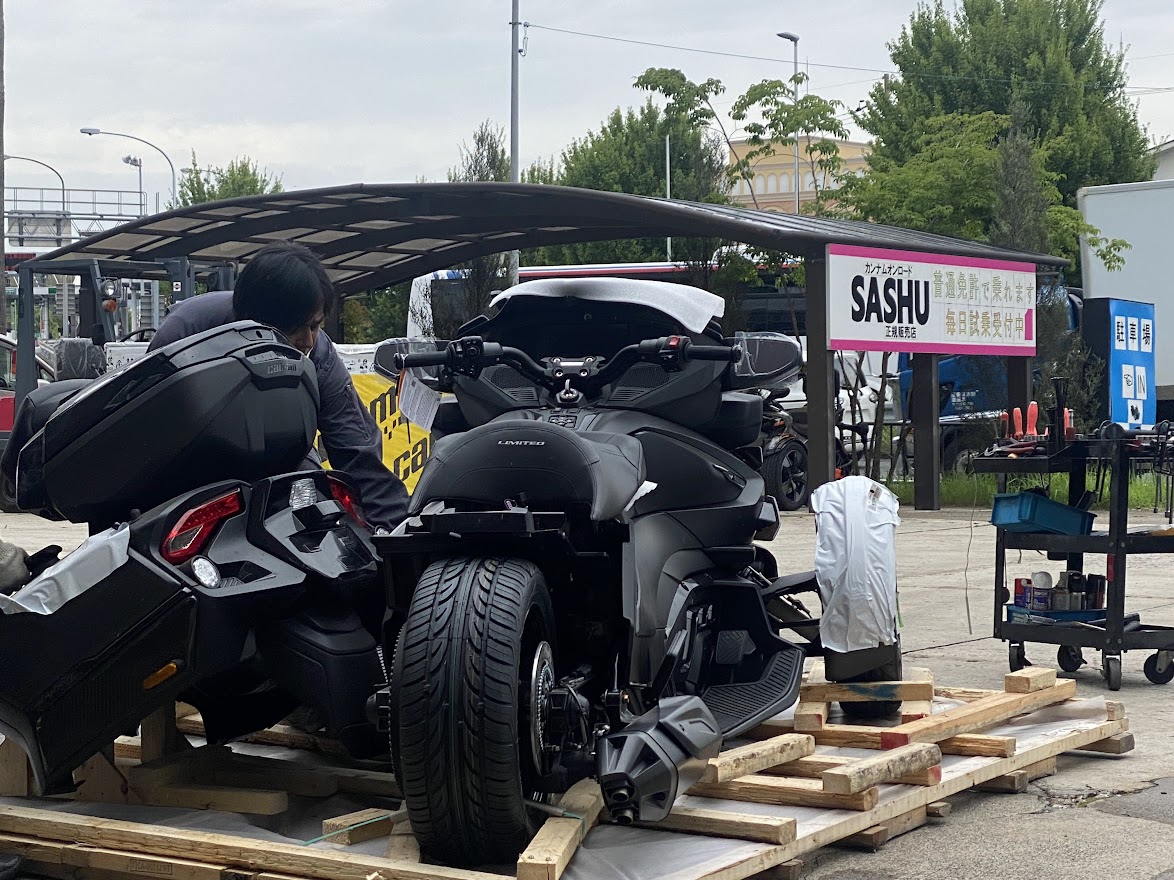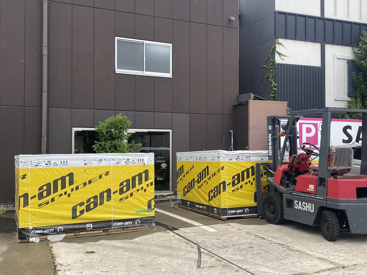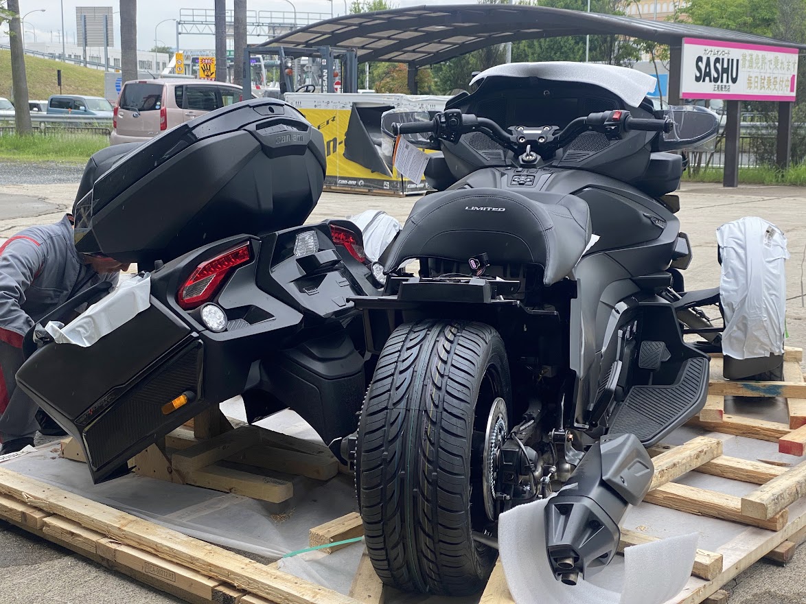 お待たせいたしました!!!! 2箱到着しました!!!! どれどれ・・・ ラベルを見ると・・・ひとつ目は SPYDER RT LTD 1330 SE6 BK/D JAP 22 BK/D JAP 22 2022年モデルの RTリミテッド カーボンブラック。 ようこそ日本へ、おこしやす京都。 ちょっと 雨降っちゃってすいません・・・。 こちらの車両は 4月からお待ちいただいたお客様の元へ 大急ぎで準備です。カーボンブラックの存在感はヤバいです・・・。 店頭でご覧いただけますが お触り厳禁にて ひとつお願いいたします。