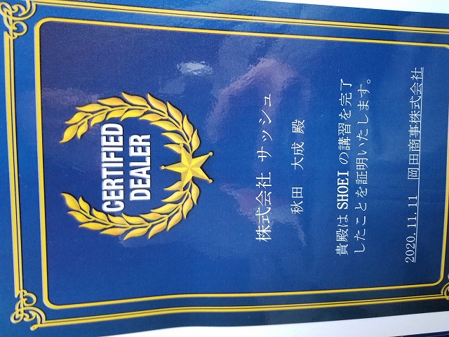 当店ではヘルメットの受注をほとんど頂くことはありませんが、最近では講習を 受けてしっかりとした販売ができないお店では販売すらできないシステムなので、 いざという時の為にショウエイさんの講習を受けてきました。 皆様ご存じの通り、最近のヘルメットは多機能、高性能なので売りっぱなしでは本来の機能 を発揮できません。 実際私自身も買ったショウエイヘルメットの一部機能を知らない、勘違いしてた 部分もありました。 講習用のヘルメットを使いながら、色々なモデルを実際に内装をばらしたりしながら 4時間の講習をみっちり受けてました。 無事講習も終了し、認定証いただけました。 ヘルメットの事でお困りでしたらアドバイスさせていただきますので、お気軽に お越しくださいね~。