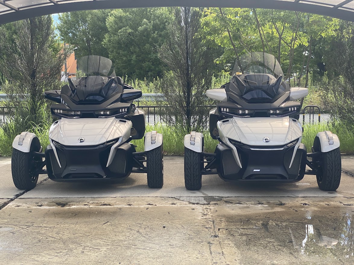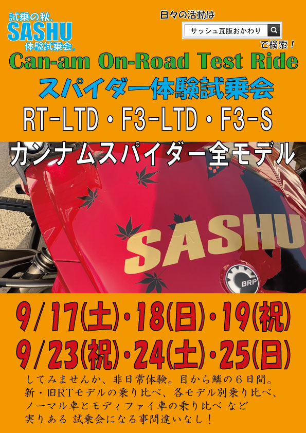 9月です。 朝晩少しずつ涼しくなってまいりました。 この時期になると 必ず聴きたくなる そんな曲。 おしらせです。 2回ある 3連休に スパイダー大試乗会 を開催することになりました。 試乗できる車両は こちら! まずは RTシリーズ ①MY20 RT-LTD アジャスタブル ドライバーバックレスト以外は ノーマルです。 RT本来の乗り心地をご体感ください。 ②MY21 RT-LTD こちらは 日本人サイズにモディファイしてあります。 コンフォートハンドル & ボードUPコンプリートキット おまけに GTスペック ドラッグブルーまで 純正RTと快適性を比較してみてください。 ③MY17 RT-LTD 中古車のお問い合わせも多数いただいております、 2017年モデルも 新旧RT比較にご利用ください。 F3シリーズ ④MY21 F3LTD ボンネットデカールが貼ってあるのと・・・ プレミアムブレーキペダルMサイズ が 付いているだけです。 ⑤MY21 F3-S Special Series 定番アイテムを装備しています。 ブルーリッジウインドシールド タンデムバックレスト プレミアムブレーキペダル・フレームマウントドリンクホルダー まれに 店頭にない場合もありますので 試乗予約をお電話いただいても大丈夫です。 お電話いただく方が確実です。 ちょっとした 試乗記念品 をご用意しております。 貸出用のヘルメットもございますが 頭が まぁでかい人は 当日ご持参ください。