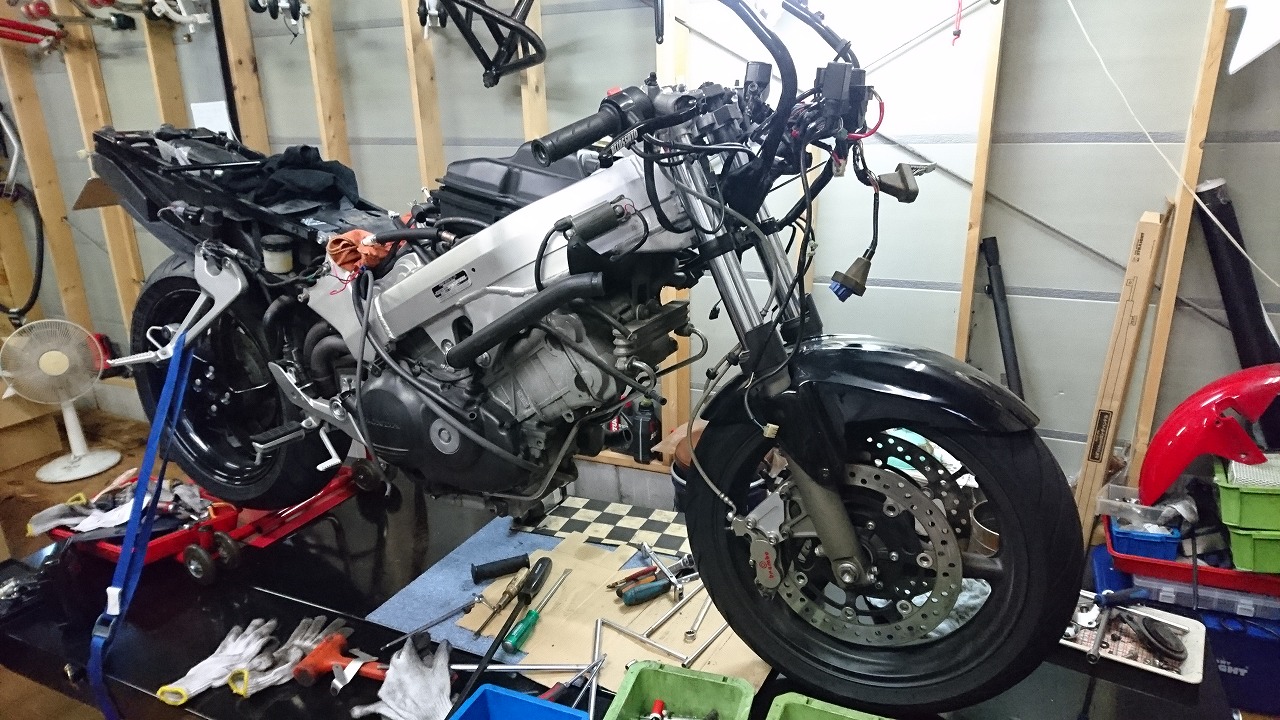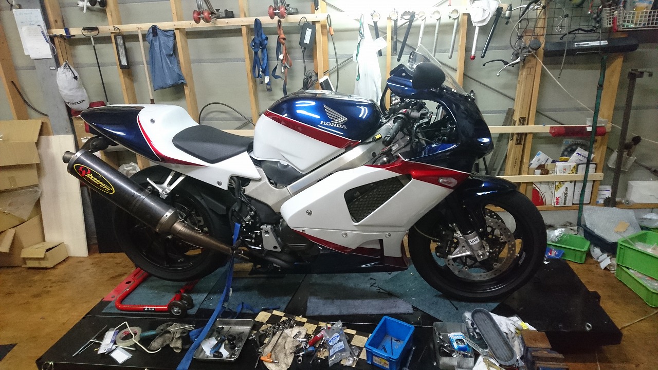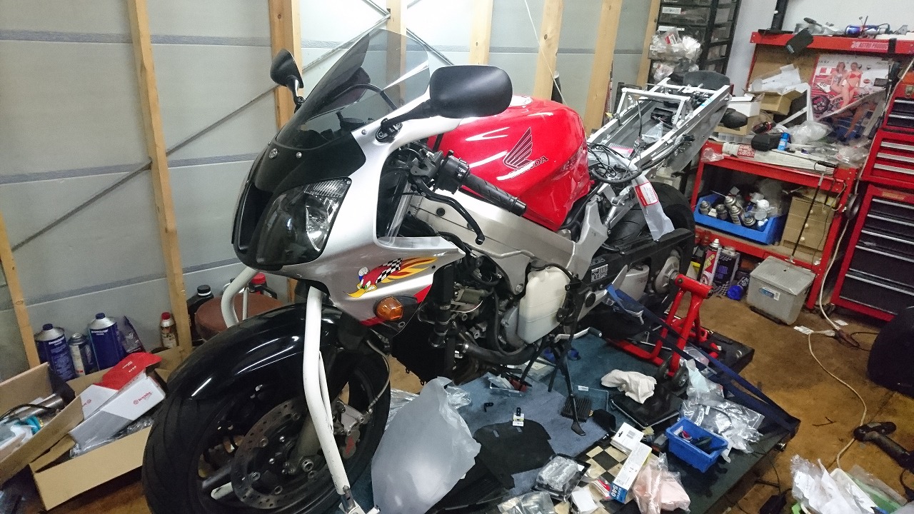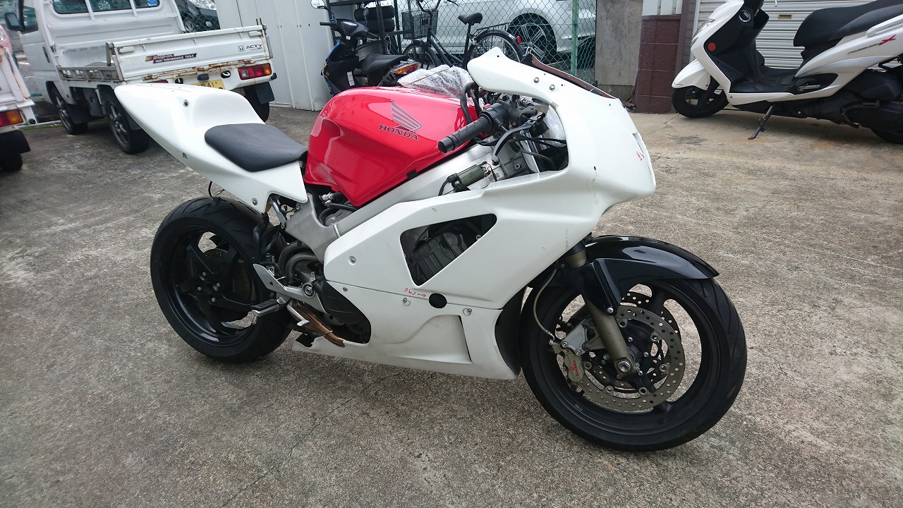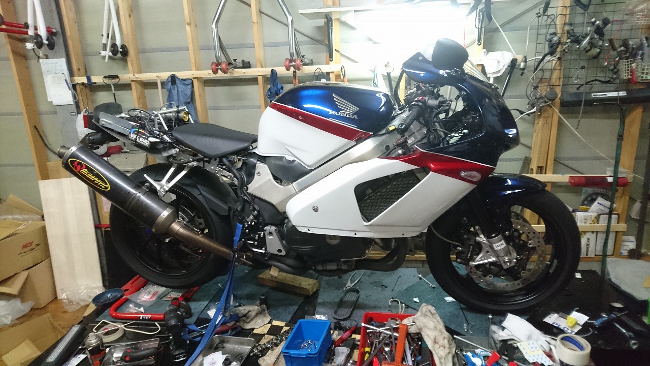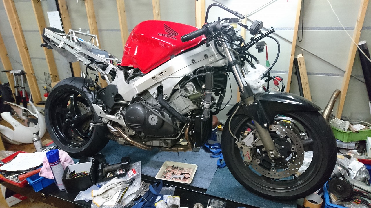 すっかりV4エンジンに魅せられた僕ですが、RC30を手放したのを後悔しつつ もんもんとしてました。 またVTECエンジンになったV4エンジンはカムギヤトレーンではなくカムチェーンで 長距離を走行するのに静かで快適なんですが、少し刺激が足りないかなと。 かと言って、RC30やRC45はもはや高すぎて買えない(笑) なので、安価なVFR800、RC46の前期型、白バイのベースになった カムギヤトレーンのツーリングモデルに狙いを定めました。 これはRC45のエンジンをストロークアップして800㏄にしたバイクなので、実は レーサーの心臓を持つツアラーです。 これをベースにレーサータイプに変えれないか?と。 幸い逆輸入の低走行車が見つかり即購入。 早速バラして、手持ちのVTR-SPのレーサーカウルを仮組してみると お! なんとか付きそうだ! ここから苦難の作業が始まりました。 元々ツアラーの車体をレーサータイプにする作業は本当に大変でした。 とりあえずデータも何もないので形にしていきます。 ステムはRC46後期の43Π、フォークはCBR600Fベースで当然連動ブレーキ解除。 シートレールはSP1のを付けれるようにげたをかまし、配線処理。 メーターも狭いカウルに入らないので小型のものに。 エンジンは最初は800Fのセンターラジエーターを付けてパワーコマンダーで セッティング。 スイングアームも800F用にしたり色々しました。 とりあえずレーサーカウルが付くようにして、ヘッドライトが付くようになんとか形に。 先にカウルを塗装に出して、手持ちのSPのノーマルカウルを取り付け試乗してみることに。 乗ってみると、エンジンも細いエキパイのせいかトルクが細く、車体はハンドリング が重くどうにもならないような代物でした(笑) VFR800のステムはオフセット多めで軽快感でると思ったのに… さあイチからやり直し。Rショックの特注やステップなどと入れていきます。 前後の車高も色々変えながら探っていきます。 そうしてるうちに塗り上がってきたので、先に外装組付けです。 めっちゃかっこよくなったので期待に満ちた走行でしたが、 やっぱりダメ。車体の姿勢、エンジンのセッティングなど問題山積み。 結局エキパイはノーマルの太いのに戻し、取り回しの関係でノーマルの サイドラジエーターに戻し、セッティング。 エンジンはV4らしいトルクになりいい感じに。 やっぱり800Fはガスを使えないのをエキパイ絞ったりメーカーは苦労して るんやなあ、と。 ただ車体はやはりこのままではダメなので色々試行錯誤。 前を上げたり下げたり、後ろを上げたり下げたり…スプリング換えたり。 最終FフォークはCBR600RR流用で姿勢をセッティング。 なんとかなって、まあちゃんと走るようになりました。 現状では80%くらいの満足度。 これ以上はスイングアームピボット位置を下げたり、前後に短いアルミタンクを 作ってもっと前に乗れるようにとか、めちゃくちゃお金かかるし現実的じゃない ので(それこそRC30とかRC45買えてしまう 笑)ここまで。 その後は細かい変更をしながらソロでマスで走り、お客様にも試乗してもらい意見をもらい なんとか人前に(?)出せるようになりました。(笑) 難点はタンクが容量多くて前後に長いので姿勢がちょっとしんどいくらいで、 航続距離は長いしロングも大丈夫なバイクになりました。 足掛け4年本当に大変で勉強になりましたが、やはりRC30や45 のような素晴らしいバイクには及ばず、若干の虚しさを感じる結果に なったのは内緒です(笑)