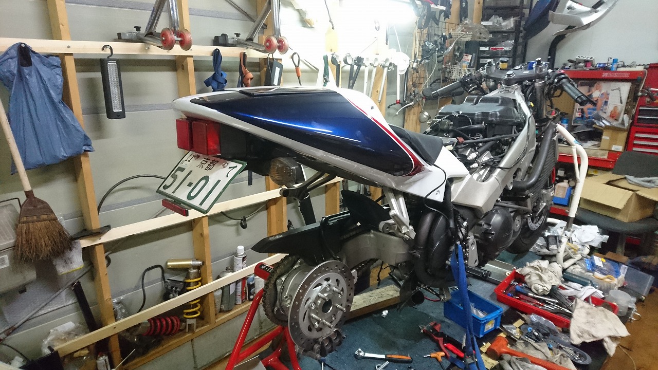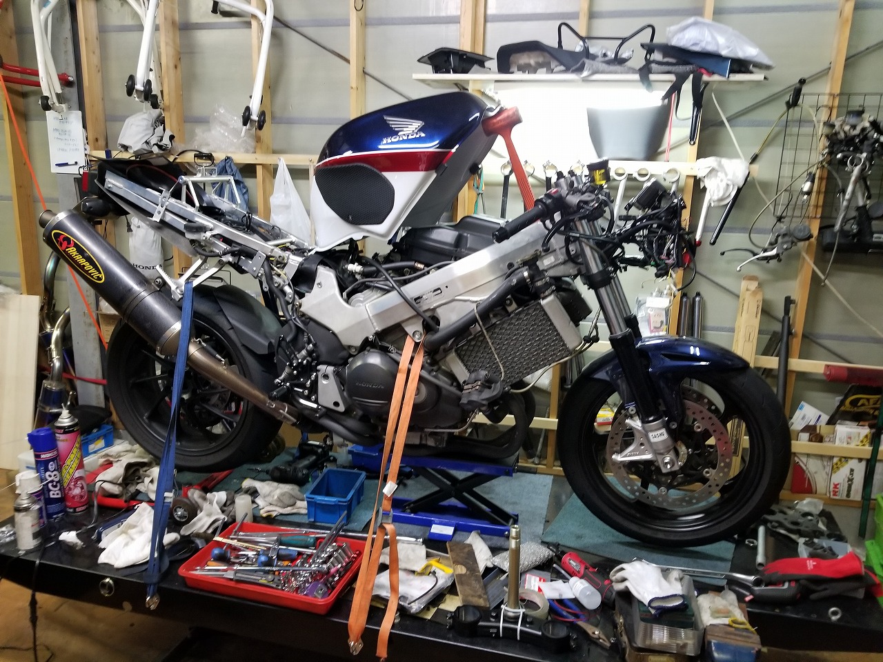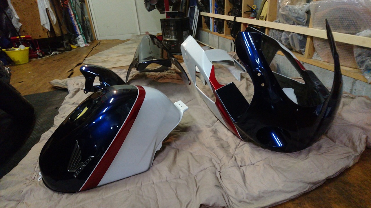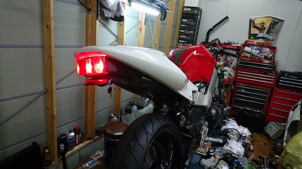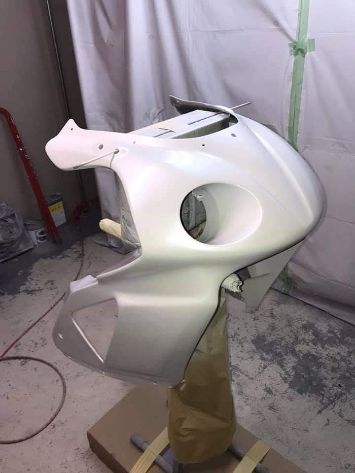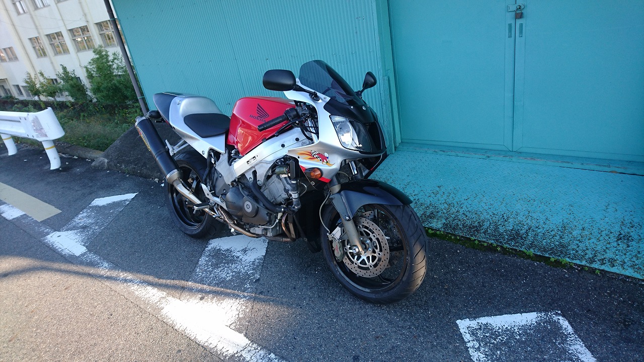 すっかりV4エンジンに魅せられた僕ですが、RC30を手放したのを後悔しつつ もんもんとしてました。 またVTECエンジンになったV4エンジンはカムギヤトレーンではなくカムチェーンで 長距離を走行するのに静かで快適なんですが、少し刺激が足りないかなと。 かと言って、RC30やRC45はもはや高すぎて買えない(笑) なので、安価なVFR800、RC46の前期型、白バイのベースになった カムギヤトレーンのツーリングモデルに狙いを定めました。 これはRC45のエンジンをストロークアップして800㏄にしたバイクなので、実は レーサーの心臓を持つツアラーです。 これをベースにレーサータイプに変えれないか?と。 幸い逆輸入の低走行車が見つかり即購入。 早速バラして、手持ちのVTR-SPのレーサーカウルを仮組してみると お! なんとか付きそうだ! ここから苦難の作業が始まりました。 元々ツアラーの車体をレーサータイプにする作業は本当に大変でした。 とりあえずデータも何もないので形にしていきます。 ステムはRC46後期の43Π、フォークはCBR600Fベースで当然連動ブレーキ解除。 シートレールはSP1のを付けれるようにげたをかまし、配線処理。 メーターも狭いカウルに入らないので小型のものに。 エンジンは最初は800Fのセンターラジエーターを付けてパワーコマンダーで セッティング。 スイングアームも800F用にしたり色々しました。 とりあえずレーサーカウルが付くようにして、ヘッドライトが付くようになんとか形に。 先にカウルを塗装に出して、手持ちのSPのノーマルカウルを取り付け試乗してみることに。 乗ってみると、エンジンも細いエキパイのせいかトルクが細く、車体はハンドリング が重くどうにもならないような代物でした(笑) VFR800のステムはオフセット多めで軽快感でると思ったのに… さあイチからやり直し。Rショックの特注やステップなどと入れていきます。 前後の車高も色々変えながら探っていきます。 そうしてるうちに塗り上がってきたので、先に外装組付けです。 めっちゃかっこよくなったので期待に満ちた走行でしたが、 やっぱりダメ。車体の姿勢、エンジンのセッティングなど問題山積み。 結局エキパイはノーマルの太いのに戻し、取り回しの関係でノーマルの サイドラジエーターに戻し、セッティング。 エンジンはV4らしいトルクになりいい感じに。 やっぱり800Fはガスを使えないのをエキパイ絞ったりメーカーは苦労して るんやなあ、と。 ただ車体はやはりこのままではダメなので色々試行錯誤。 前を上げたり下げたり、後ろを上げたり下げたり…スプリング換えたり。 最終FフォークはCBR600RR流用で姿勢をセッティング。 なんとかなって、まあちゃんと走るようになりました。 現状では80%くらいの満足度。 これ以上はスイングアームピボット位置を下げたり、前後に短いアルミタンクを 作ってもっと前に乗れるようにとか、めちゃくちゃお金かかるし現実的じゃない ので(それこそRC30とかRC45買えてしまう 笑)ここまで。 その後は細かい変更をしながらソロでマスで走り、お客様にも試乗してもらい意見をもらい なんとか人前に(?)出せるようになりました。(笑) 難点はタンクが容量多くて前後に長いので姿勢がちょっとしんどいくらいで、 航続距離は長いしロングも大丈夫なバイクになりました。 足掛け4年本当に大変で勉強になりましたが、やはりRC30や45 のような素晴らしいバイクには及ばず、若干の虚しさを感じる結果に なったのは内緒です(笑)