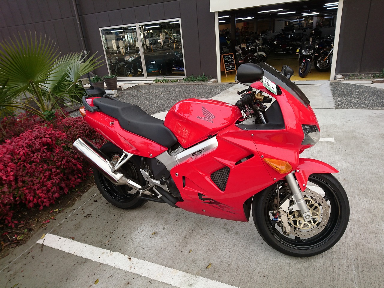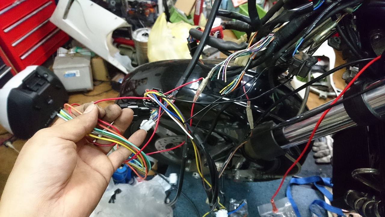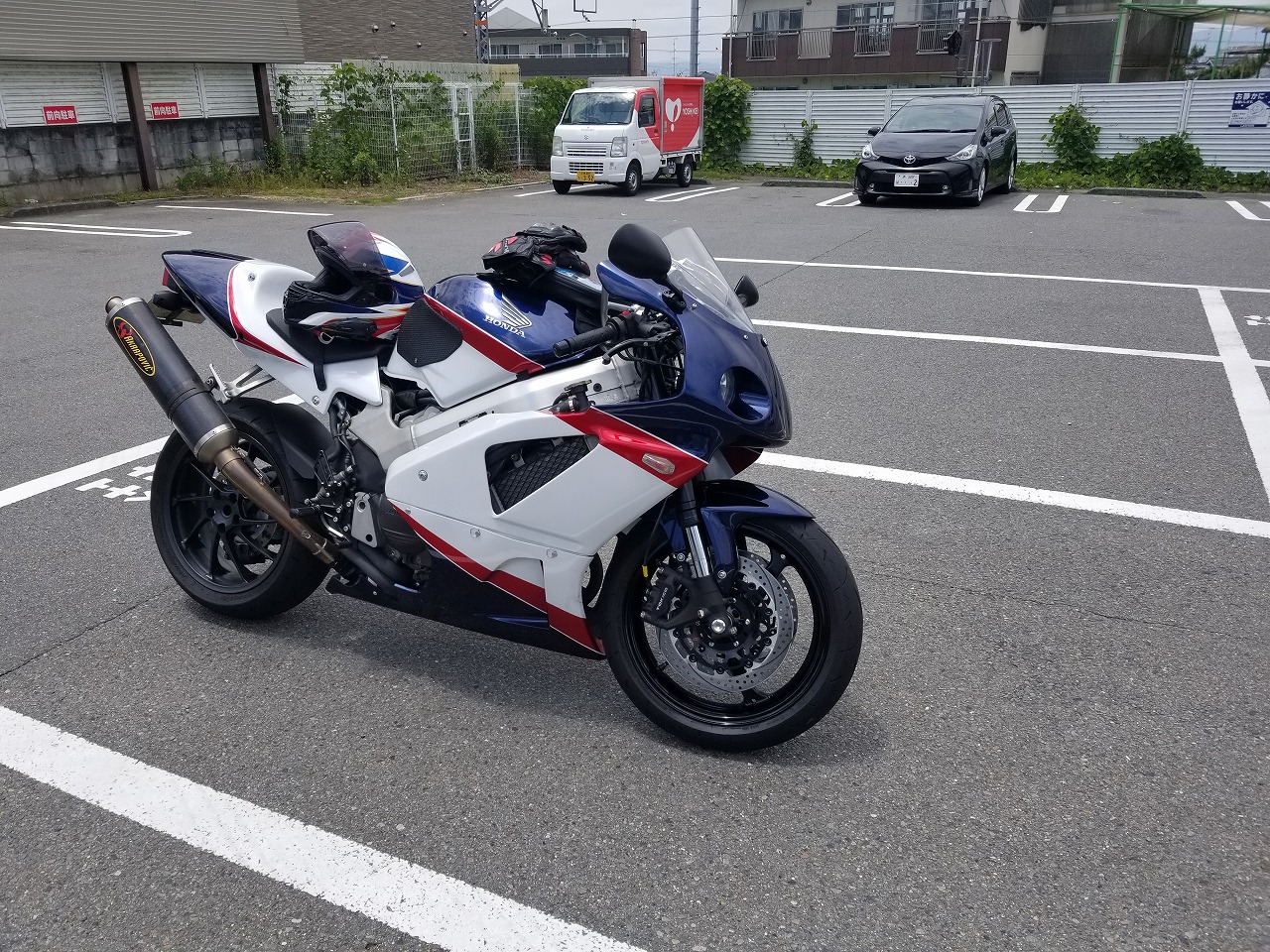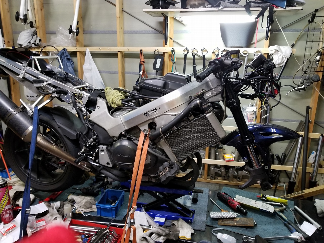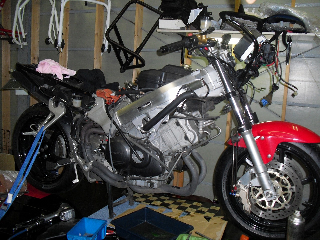 すっかりV4エンジンに魅せられた僕ですが、RC30を手放したのを後悔しつつ もんもんとしてました。 またVTECエンジンになったV4エンジンはカムギヤトレーンではなくカムチェーンで 長距離を走行するのに静かで快適なんですが、少し刺激が足りないかなと。 かと言って、RC30やRC45はもはや高すぎて買えない(笑) なので、安価なVFR800、RC46の前期型、白バイのベースになった カムギヤトレーンのツーリングモデルに狙いを定めました。 これはRC45のエンジンをストロークアップして800㏄にしたバイクなので、実は レーサーの心臓を持つツアラーです。 これをベースにレーサータイプに変えれないか?と。 幸い逆輸入の低走行車が見つかり即購入。 早速バラして、手持ちのVTR-SPのレーサーカウルを仮組してみると お! なんとか付きそうだ! ここから苦難の作業が始まりました。 元々ツアラーの車体をレーサータイプにする作業は本当に大変でした。 とりあえずデータも何もないので形にしていきます。 ステムはRC46後期の43Π、フォークはCBR600Fベースで当然連動ブレーキ解除。 シートレールはSP1のを付けれるようにげたをかまし、配線処理。 メーターも狭いカウルに入らないので小型のものに。 エンジンは最初は800Fのセンターラジエーターを付けてパワーコマンダーで セッティング。 スイングアームも800F用にしたり色々しました。 とりあえずレーサーカウルが付くようにして、ヘッドライトが付くようになんとか形に。 先にカウルを塗装に出して、手持ちのSPのノーマルカウルを取り付け試乗してみることに。 乗ってみると、エンジンも細いエキパイのせいかトルクが細く、車体はハンドリング が重くどうにもならないような代物でした(笑) VFR800のステムはオフセット多めで軽快感でると思ったのに… さあイチからやり直し。Rショックの特注やステップなどと入れていきます。 前後の車高も色々変えながら探っていきます。 そうしてるうちに塗り上がってきたので、先に外装組付けです。 めっちゃかっこよくなったので期待に満ちた走行でしたが、 やっぱりダメ。車体の姿勢、エンジンのセッティングなど問題山積み。 結局エキパイはノーマルの太いのに戻し、取り回しの関係でノーマルの サイドラジエーターに戻し、セッティング。 エンジンはV4らしいトルクになりいい感じに。 やっぱり800Fはガスを使えないのをエキパイ絞ったりメーカーは苦労して るんやなあ、と。 ただ車体はやはりこのままではダメなので色々試行錯誤。 前を上げたり下げたり、後ろを上げたり下げたり…スプリング換えたり。 最終FフォークはCBR600RR流用で姿勢をセッティング。 なんとかなって、まあちゃんと走るようになりました。 現状では80%くらいの満足度。 これ以上はスイングアームピボット位置を下げたり、前後に短いアルミタンクを 作ってもっと前に乗れるようにとか、めちゃくちゃお金かかるし現実的じゃない ので(それこそRC30とかRC45買えてしまう 笑)ここまで。 その後は細かい変更をしながらソロでマスで走り、お客様にも試乗してもらい意見をもらい なんとか人前に(?)出せるようになりました。(笑) 難点はタンクが容量多くて前後に長いので姿勢がちょっとしんどいくらいで、 航続距離は長いしロングも大丈夫なバイクになりました。 足掛け4年本当に大変で勉強になりましたが、やはりRC30や45 のような素晴らしいバイクには及ばず、若干の虚しさを感じる結果に なったのは内緒です(笑)