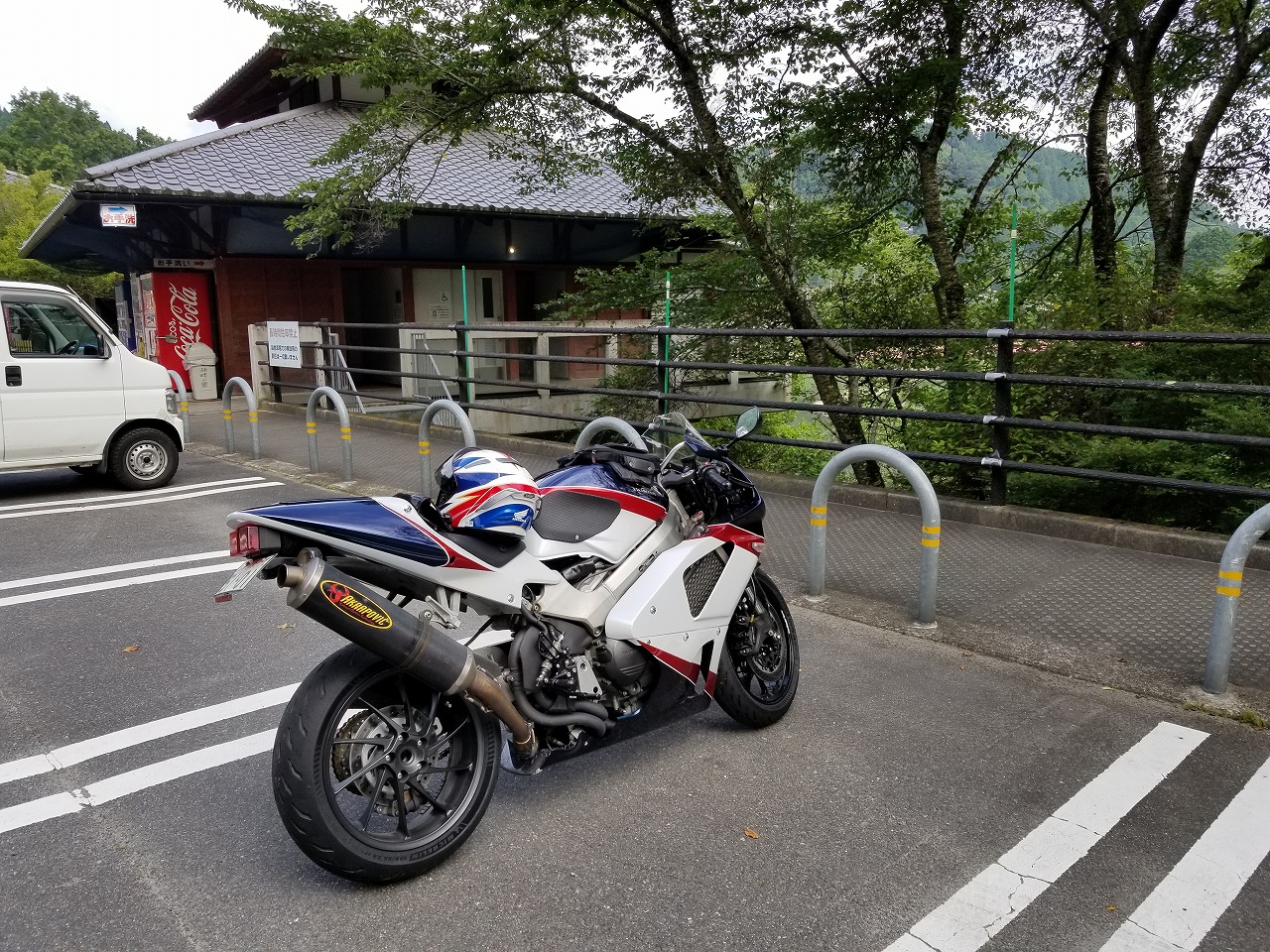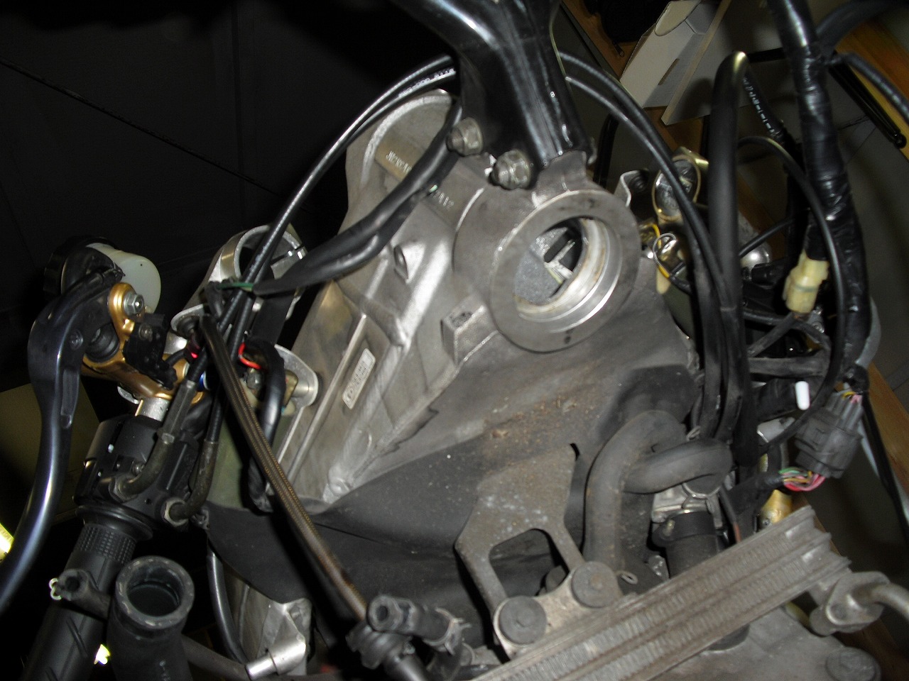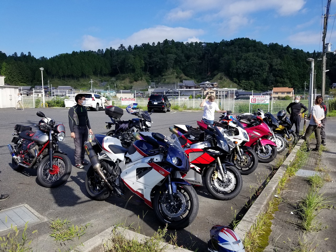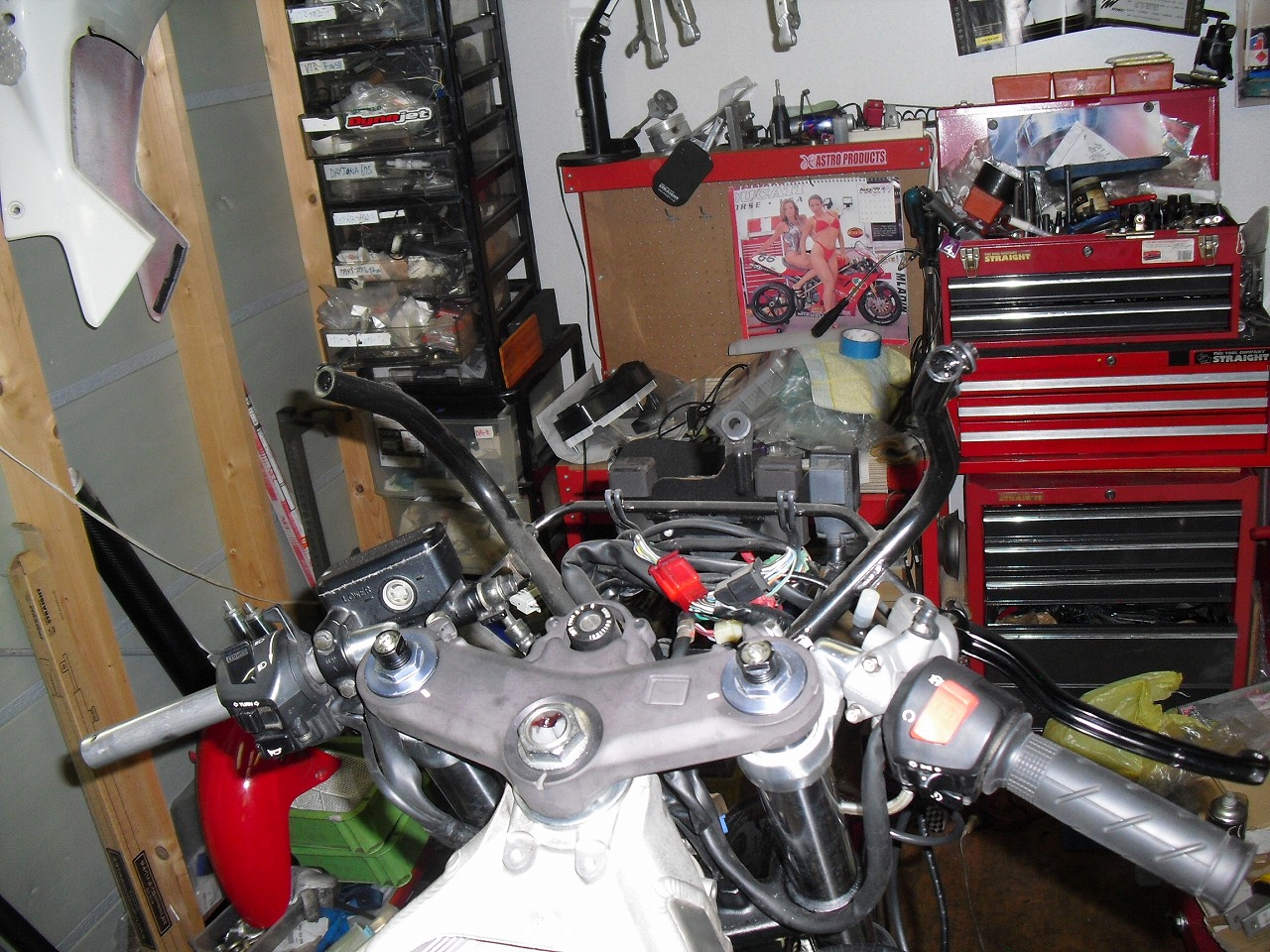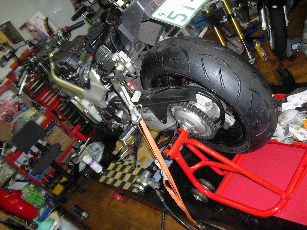 すっかりV4エンジンに魅せられた僕ですが、RC30を手放したのを後悔しつつ もんもんとしてました。 またVTECエンジンになったV4エンジンはカムギヤトレーンではなくカムチェーンで 長距離を走行するのに静かで快適なんですが、少し刺激が足りないかなと。 かと言って、RC30やRC45はもはや高すぎて買えない(笑) なので、安価なVFR800、RC46の前期型、白バイのベースになった カムギヤトレーンのツーリングモデルに狙いを定めました。 これはRC45のエンジンをストロークアップして800㏄にしたバイクなので、実は レーサーの心臓を持つツアラーです。 これをベースにレーサータイプに変えれないか?と。 幸い逆輸入の低走行車が見つかり即購入。 早速バラして、手持ちのVTR-SPのレーサーカウルを仮組してみると お! なんとか付きそうだ! ここから苦難の作業が始まりました。 元々ツアラーの車体をレーサータイプにする作業は本当に大変でした。 とりあえずデータも何もないので形にしていきます。 ステムはRC46後期の43Π、フォークはCBR600Fベースで当然連動ブレーキ解除。 シートレールはSP1のを付けれるようにげたをかまし、配線処理。 メーターも狭いカウルに入らないので小型のものに。 エンジンは最初は800Fのセンターラジエーターを付けてパワーコマンダーで セッティング。 スイングアームも800F用にしたり色々しました。 とりあえずレーサーカウルが付くようにして、ヘッドライトが付くようになんとか形に。 先にカウルを塗装に出して、手持ちのSPのノーマルカウルを取り付け試乗してみることに。 乗ってみると、エンジンも細いエキパイのせいかトルクが細く、車体はハンドリング が重くどうにもならないような代物でした(笑) VFR800のステムはオフセット多めで軽快感でると思ったのに… さあイチからやり直し。Rショックの特注やステップなどと入れていきます。 前後の車高も色々変えながら探っていきます。 そうしてるうちに塗り上がってきたので、先に外装組付けです。 めっちゃかっこよくなったので期待に満ちた走行でしたが、 やっぱりダメ。車体の姿勢、エンジンのセッティングなど問題山積み。 結局エキパイはノーマルの太いのに戻し、取り回しの関係でノーマルの サイドラジエーターに戻し、セッティング。 エンジンはV4らしいトルクになりいい感じに。 やっぱり800Fはガスを使えないのをエキパイ絞ったりメーカーは苦労して るんやなあ、と。 ただ車体はやはりこのままではダメなので色々試行錯誤。 前を上げたり下げたり、後ろを上げたり下げたり…スプリング換えたり。 最終FフォークはCBR600RR流用で姿勢をセッティング。 なんとかなって、まあちゃんと走るようになりました。 現状では80%くらいの満足度。 これ以上はスイングアームピボット位置を下げたり、前後に短いアルミタンクを 作ってもっと前に乗れるようにとか、めちゃくちゃお金かかるし現実的じゃない ので(それこそRC30とかRC45買えてしまう 笑)ここまで。 その後は細かい変更をしながらソロでマスで走り、お客様にも試乗してもらい意見をもらい なんとか人前に(?)出せるようになりました。(笑) 難点はタンクが容量多くて前後に長いので姿勢がちょっとしんどいくらいで、 航続距離は長いしロングも大丈夫なバイクになりました。 足掛け4年本当に大変で勉強になりましたが、やはりRC30や45 のような素晴らしいバイクには及ばず、若干の虚しさを感じる結果に なったのは内緒です(笑)