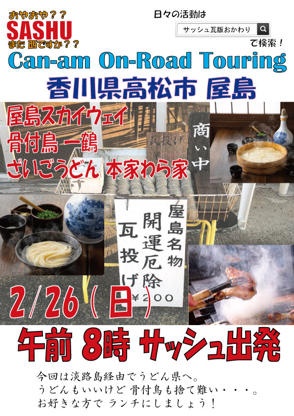 1月の定例カンナムツーリングが 2月にズレ込んだので てっきり次回は3月末だと思い込んでいましたが、 ・・・しっかり催促の連絡をいただきました。 はい、2月末も ちゃんとします! ★ガソリン満タンでお集まりください★ 2/26 (日) 午前8時 サッシュ出発 目的地:香川県 高松市 屋島方面 うどん県なので 讃岐うどんはハズせないんですが 以前 食べた 骨付鳥が どーしても 食べたくなったので ランチは2か所設定しました。 鳥か うどんか その時の気分で 選んでください。 胃袋に余裕と自信のある方は 迷わずハシゴしましょう。 予定のルートはこんなかんじです。 https://goo.gl/maps/qzqYj4Jn9rzW31jD7 途中合流は 室津PA 津田の松原SA となります。