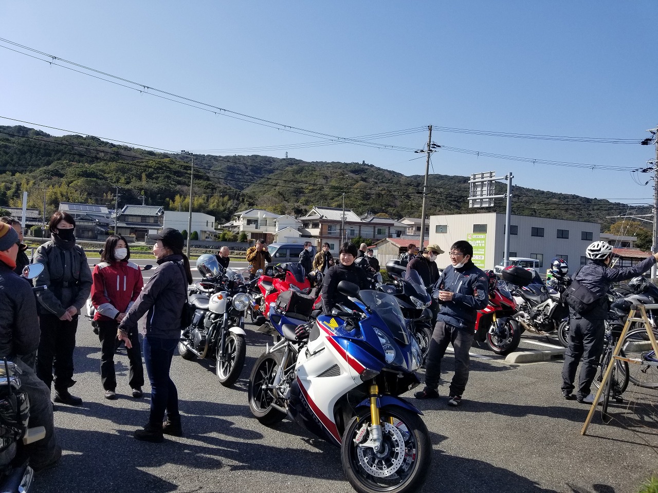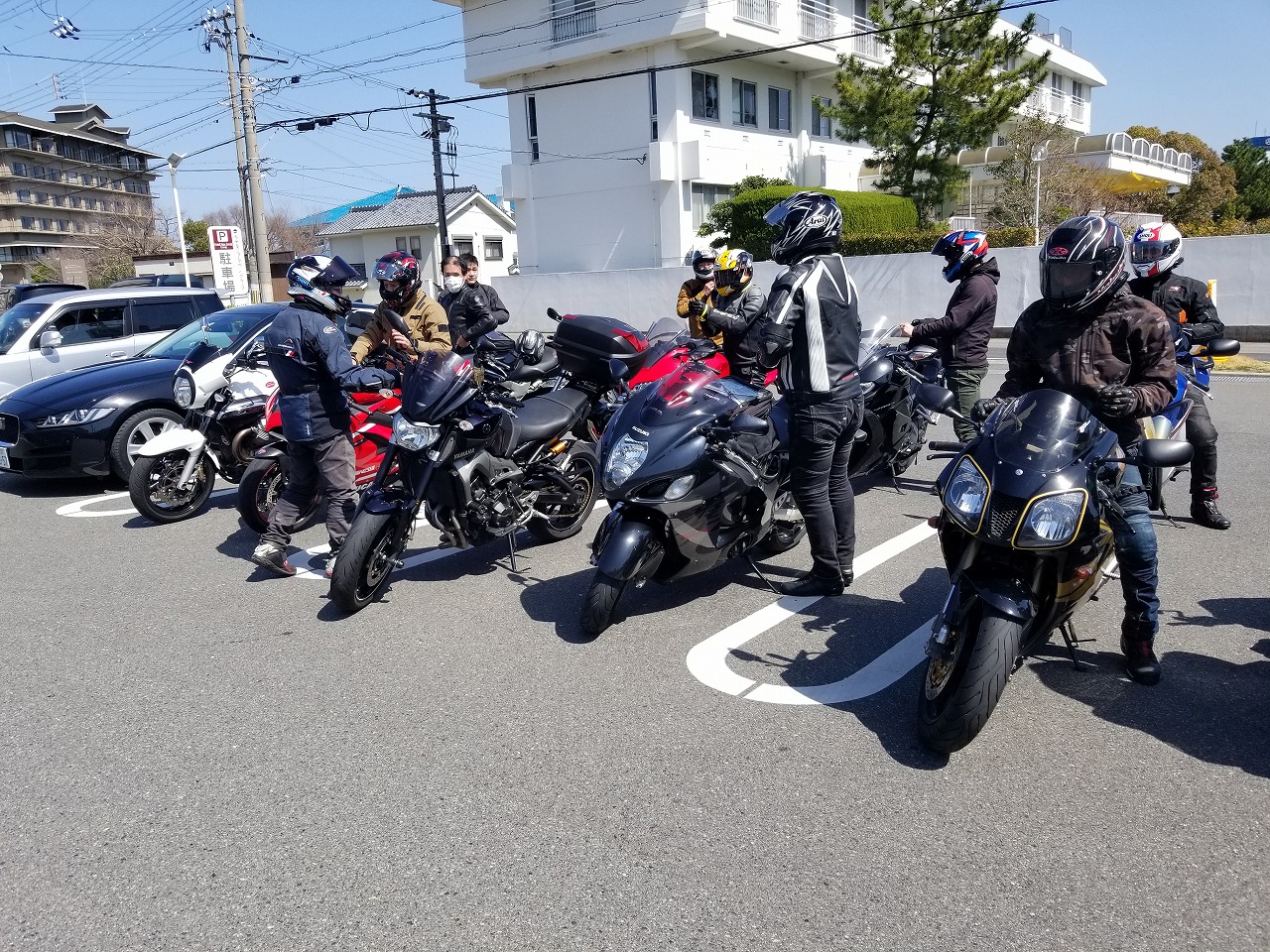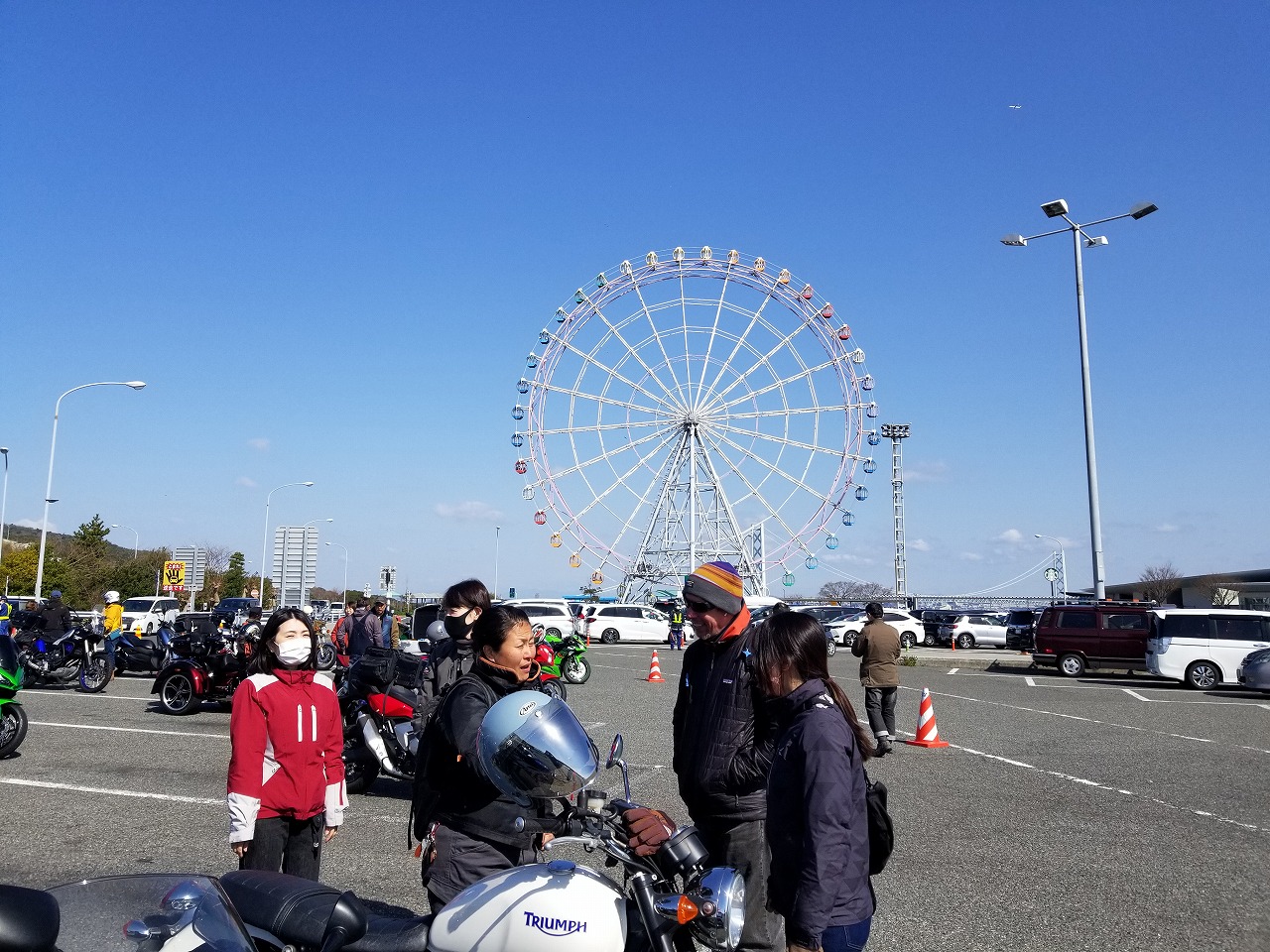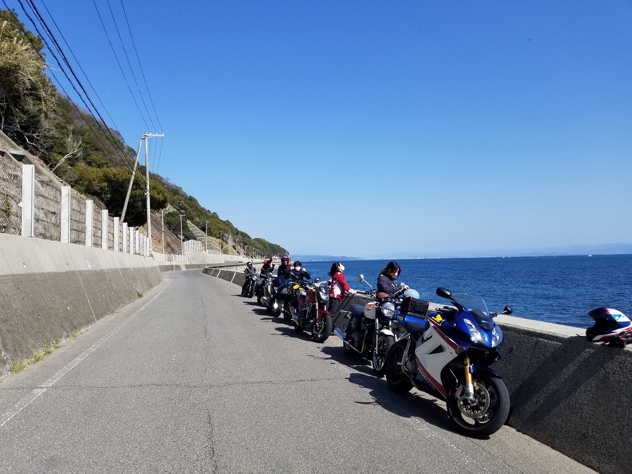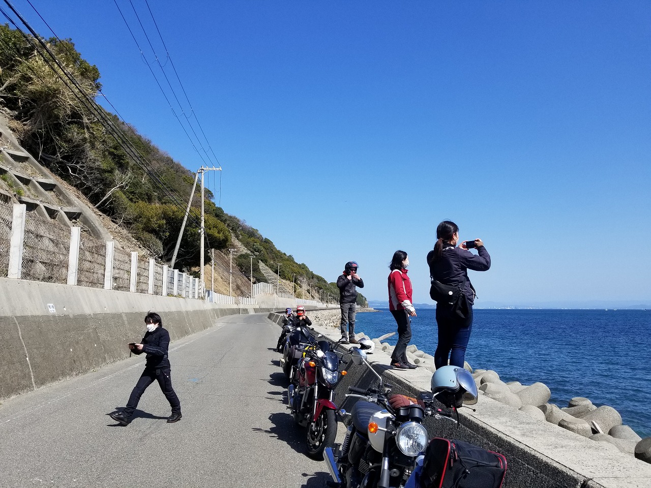 今年の冬は寒かったですね~ 2月のツーリングも中止になり、3月にしてやっと開催。 Ladysと英会話、中級、ベテランクラスツーリングの同時開催。 まずサッシュに13人が集合 今回の行先は初心に戻り20年ぶりに淡路島です。 朝はかなり寒かったですが、申し分ない快晴で最高のツーリング日和! 今回は250のスクーターのアメリカ人も参加して英会話も弾みます。 サッシュを出発してまず新名神の宝塚北サービスエリアを目指します。 ここで大阪在住のお客様と合流して淡路島を目指します。 山の中は結構寒い。 あっという間に淡路サービスエリアに到着。 高速道路のおかげで近くなりましたねー ここでさらに4人合流。 Ladys &Englishチームは7人 ベテランクラスは11人の大所帯に。 とてもじゃないが一纏めは無理!それに食事も一つの店では無理なので ベテランクラスはお客様に任せて、それぞれの昼食場所に向けて出発。 最近淡路島は人気らしくとんでもない車の量。 すでに渋滞してます。 天使のパンケーキの淡路島本店の前を通りましたが、あり得ない人の列でした(笑) 島の北側を西に回り、海沿いを走り山を抜けて志筑に到着。 11時過ぎAWAJI SEASIDE WALK CAFEに到着 すでに駐車場いっぱい。 なんとか隙間に停めます。 幸いすぐに席が空いてラッキーでした。お腹すいた! 淡路島バーガーをいただきました。 オニオンフライもめちゃくちゃ美味しくて大満足! 2000円近い価格ですが納得できる内容でした。 店を出る頃には店の前には待ちの列が… タイミング良かった! ベテランクラスは少し北にあるうどんの有名店 いづも庵さんへ。 こちらは結構並んだらしいですが、とてもおいしかったらしいです。 少し南下したコンビニで合流。 それぞれの昼食の話題で盛り上がります。 そこからハイライトの南側の海沿いの快走路へ。 海がキラキラしてて最高の景色を満喫。 コンビニで休憩しながら英会話を楽しみます そこから本来は鳴門のうず潮方面に向かいたかったんですが、あまりの車の多さに 断念して、高速道路でまた淡路サービスエリアに。 淡路サービスエリアに入るのに渋滞してて大変でした… ここから各自流れ解散で帰っていきます。 高速道路も渋滞がひどく、ひーひー言いながら宝塚北サービスエリアで最後の休憩。 SAから本線見てもひどい渋滞で、全然車が進んでないのが見えてゲンナリですが、 日も暮れてきてるので覚悟を決めて各自出発して帰って行きました。 本日は最高の天気でしたが、車、渋滞が多すぎなかなか大変なツーリングでした(笑) でもAさんのおかげで英会話も楽しめ、バイクの話も盛り上がり楽しい一日でした! 次回は5月の予定になってます。日程決まったらUPしますね~