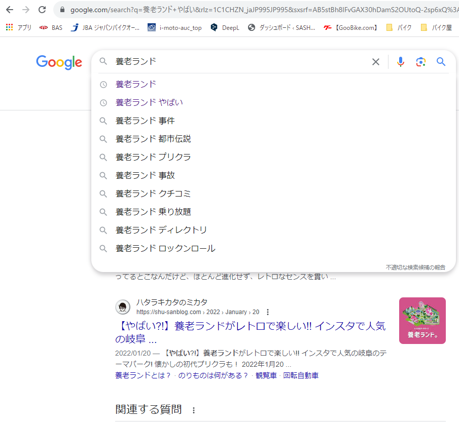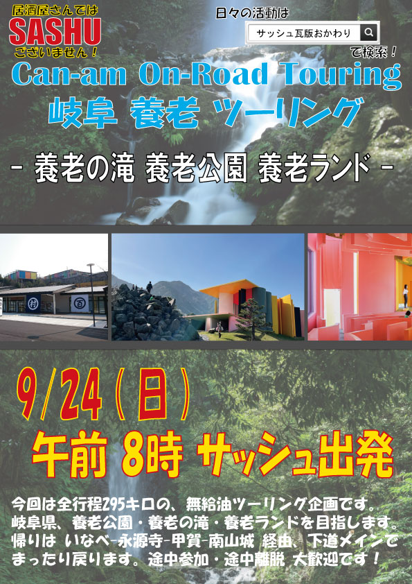 来月9月の カンナム定例ツーリングは こちら! ※車検の通るマフラーでご参加ください※ 9/24 (日):午前8時 サッシュ出発 目的地:岐阜県養老町 養老公園 今回は全行程295キロのショートツーリングです。 ショートツーリングです!ショート・・??? ・・・無給油ツーリングです! タイムスケジュールは以下の通りです。 ルートはこんなかんじで。 グーグルMAPで確認 オール高速道路だと味気ないので 下道をふんだんに使用します。 養老公園のそばに養老の滝はありますが、 養老乃瀧はございません。くれぐれもご注意ください。 ※駐車料金とそれぞれのテーマパークで 入園料等必要になります※ 個人的には 今年開園50周年の 養老ランド が 一番気になります。 Google先生の予測変換が・・・ いや~ これは是非とも行ってみたいですねぇ~。 養老ランド内 レストランひまわり も要チェックです。 あと 養老公園内の 養老天命反転地 も気になります。 ランチ後の養老公園出発は13時です。 ここで一旦解散とします。 本隊は いなべ・永源寺・甲賀・南山城 経由でサッシュまで戻る予定です。 南山城までは下道で のんびり行きます。 来月も楽しみましょう!