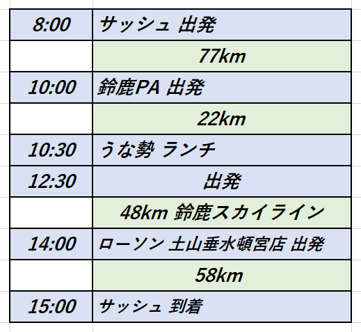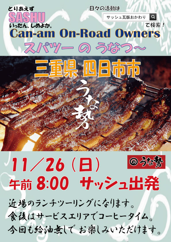 月が変わって、今月11月の定例ツーリングのお知らせです。 今回も給油ポイントはございません。 集合時ガソリン満タンでお集まりください。 11/26(日) 午前8時 サッシュ出発 目的地:うな勢 (三重県四日市市) ルートとタイムスケジュールは以下の通りです。 ★ルート グーグルマップでルート確認 ★タイムスケジュール ランチ後に鈴鹿スカイラインを目指します。 今回は 明るいうちに戻ります。
