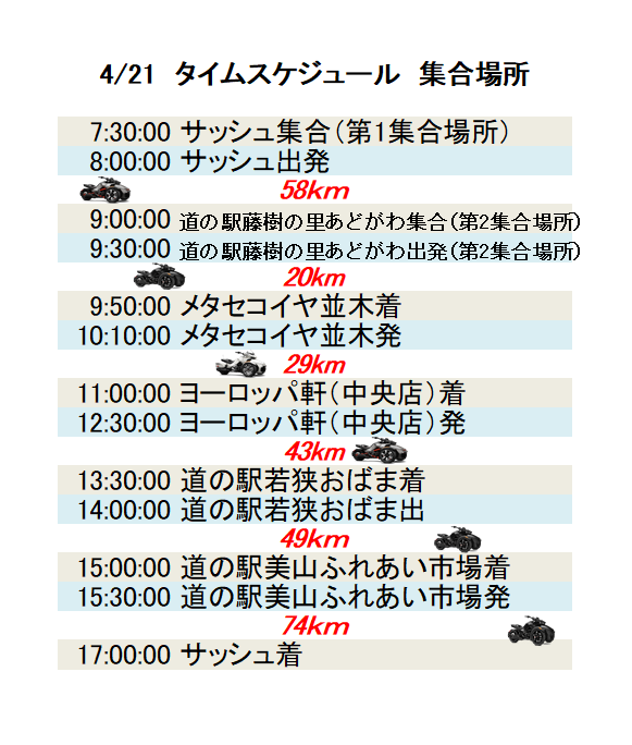 こんにちは。 4月のスパイダーツーリングになります。 ほぼ高速道路を使わない地道メインのツーリングにしました。 皆様のご参加お待ちしております。 ※ヨーロッパ軒までの休憩時間は、お昼ご飯の時間の都合上変更する事があります。